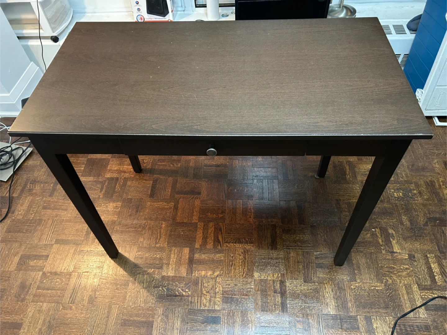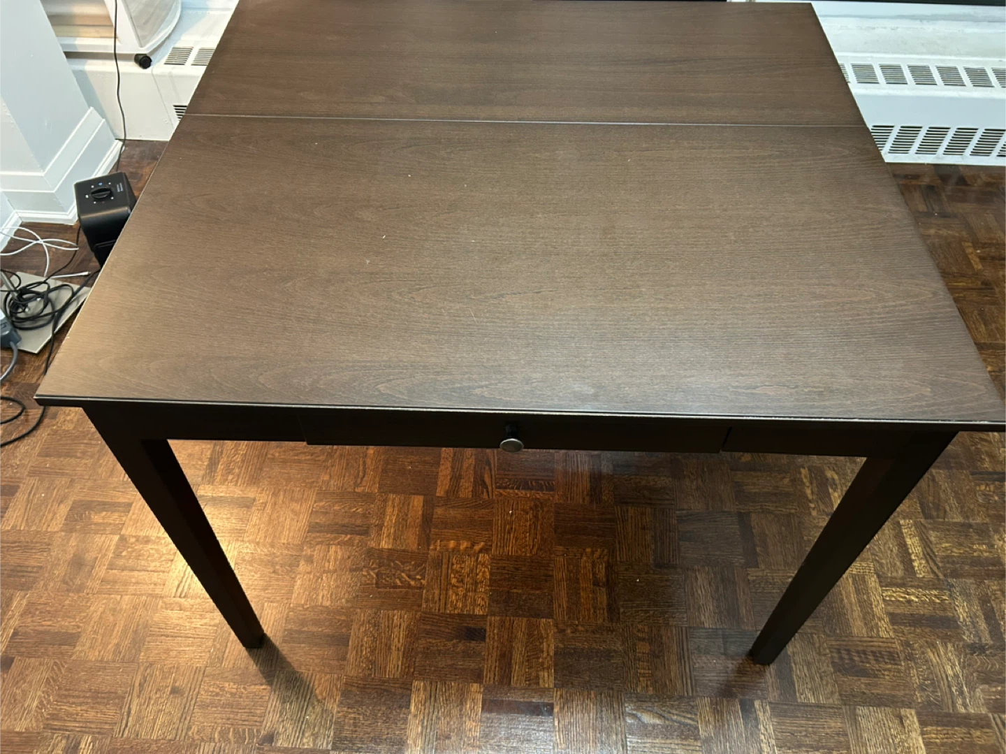 Like new IKEA drop-leaf dining table, with one drawer. Can double as a desk if needed. Legs taken off for ease of transport. All screws/bolts etc included. Available for pickup at Broadview/Danforth.