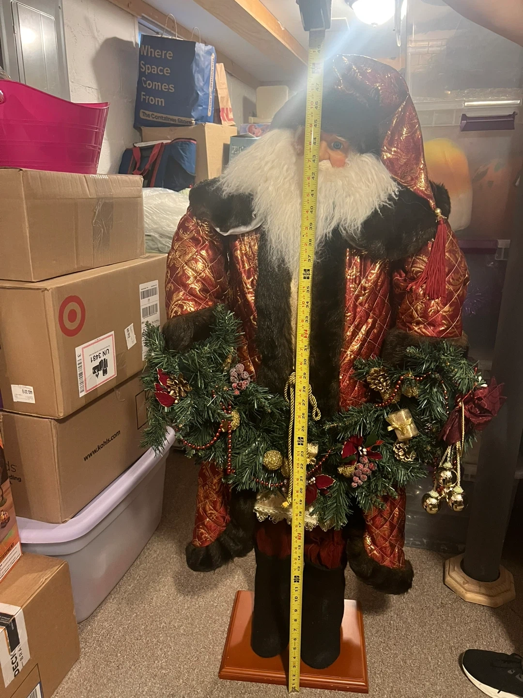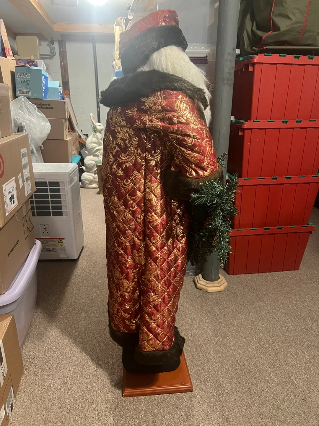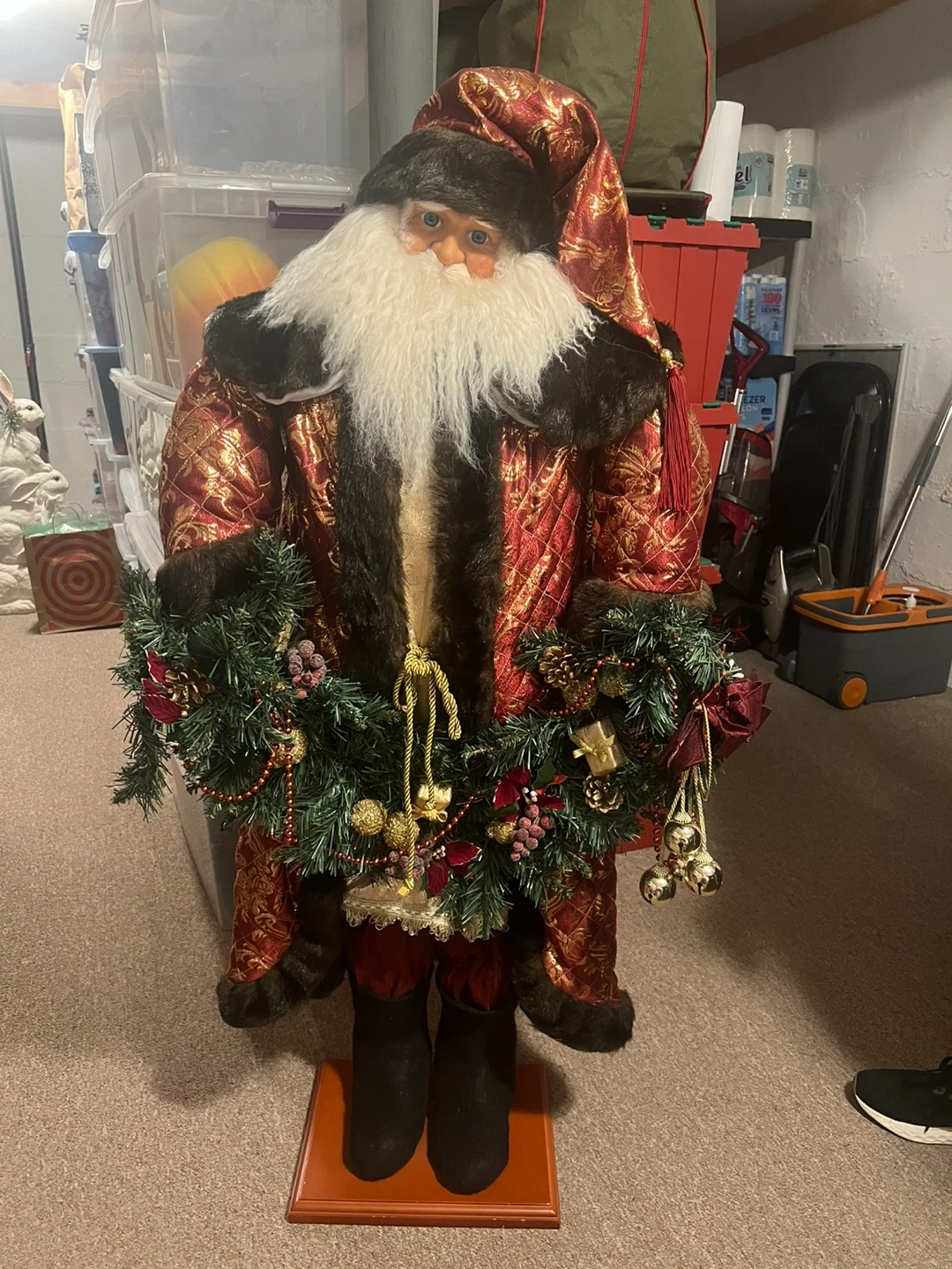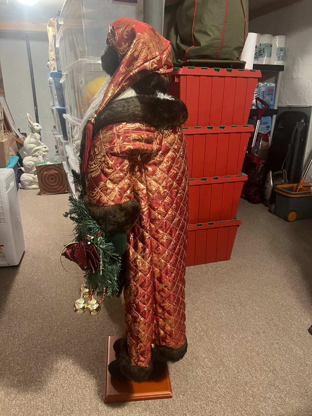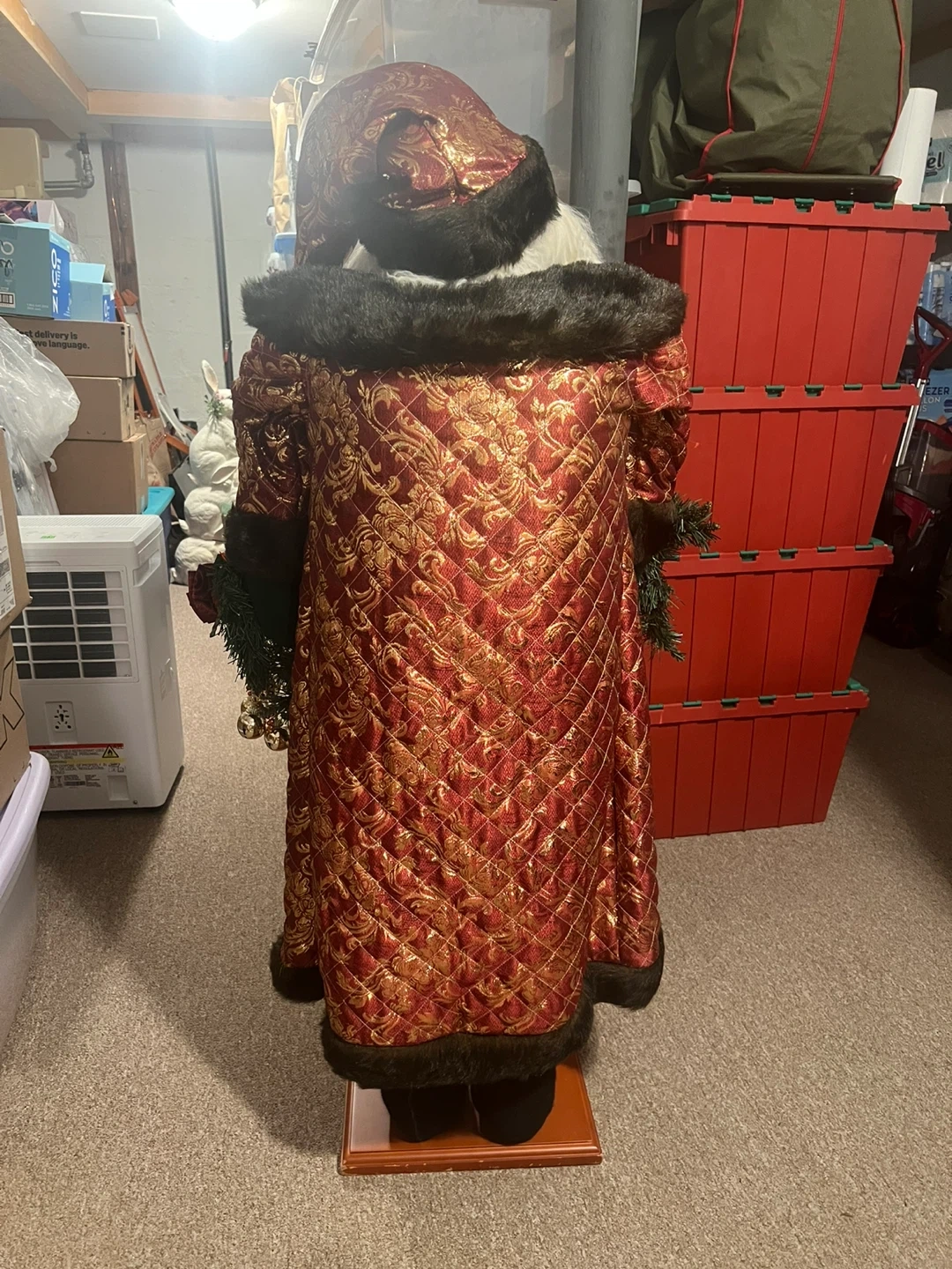 This is a decorative Santa Claus figurine. It features a detailed coat with a quilted pattern, faux fur trim, and festive wreath accents. The Santa has a long white beard and a matching hat. It would be a great addition to your holiday decor. There are a few Knicks on the base, but otherwise a beautiful piece.