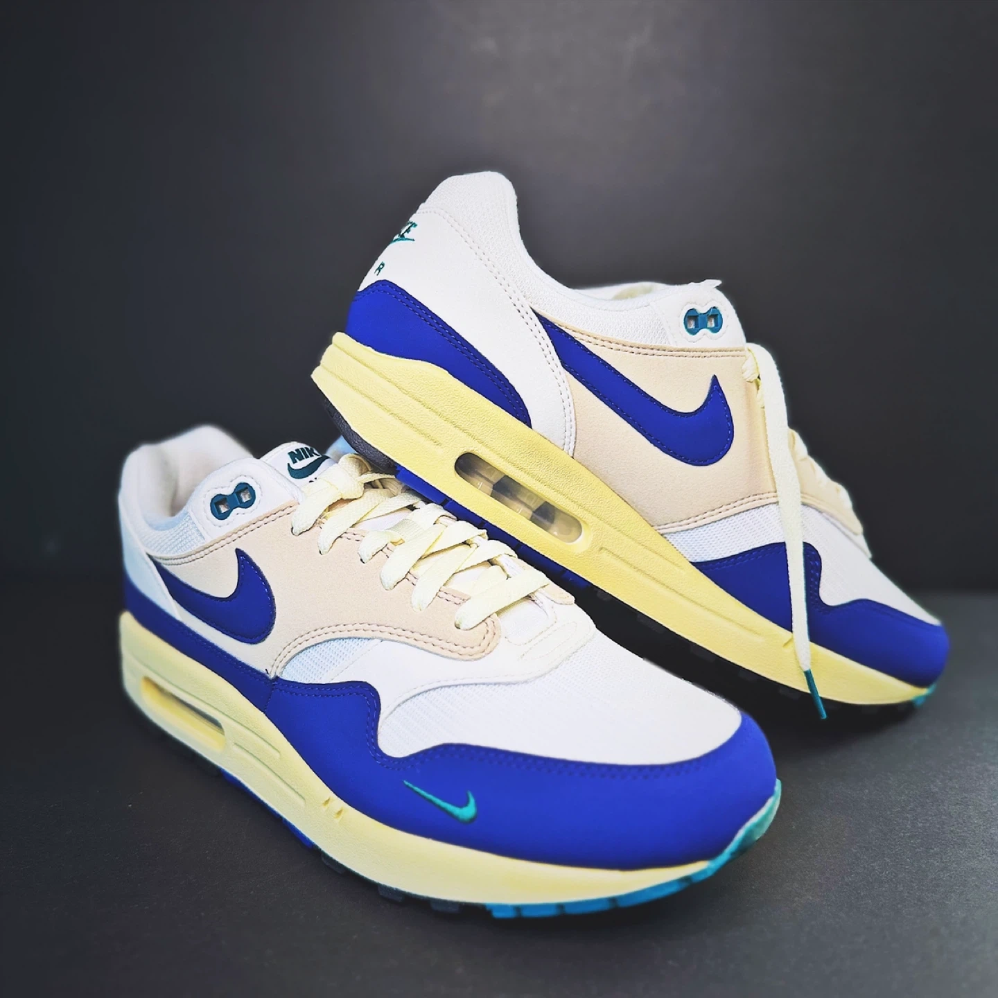 Selling a pair of Nike Air Max 1 "Athletic Department Deep Royal Blue" shoes. The shoes feature a white, blue, and beige colourway. Great for casual wear!