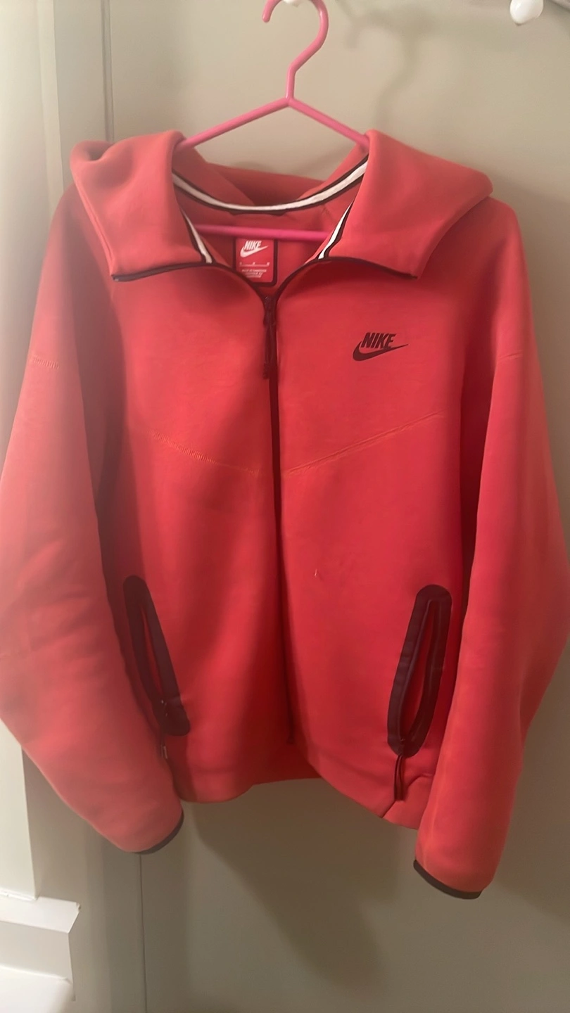 Selling a Nike Tech Fleece hoodie in size medium. It's in great condition and ready for a new owner! The colour is a vibrant red, perfect for adding a pop of colour to your wardrobe.