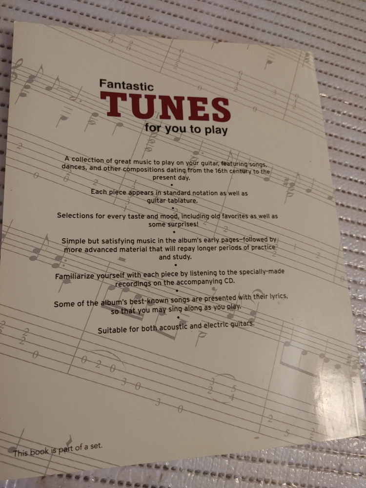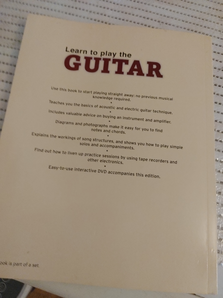 5$ EACH Selling a learn-to-play guitar set. It includes a CD called 'Ultimate Guitar' and a book. The CD has a running time of approximately 50 minutes. The book teaches you the basics of acoustic and electric guitar technique. It also includes an interactive DVD!