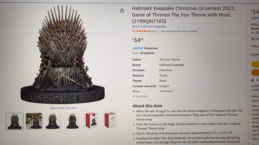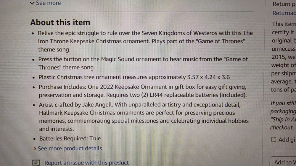 Buy & SellGame of Thrones Keepsake BrandNewGame of Thrones Keepsake BrandNew$30Game of thrones Hallmark Keepsake Christmas Ornament 2022 with music brand new bought from Amazon.WHERE TO MEETFincham PlazaView MapSELLERKeshMarkham Village503 reviews0 chats·0 favorites·12 viewsSEND CHAT TO SELLERHi Kesh! I’m interested in your listing.Hi Kesh! I’m interested in your listing.Get the Karrot app to chatSign In to chat
