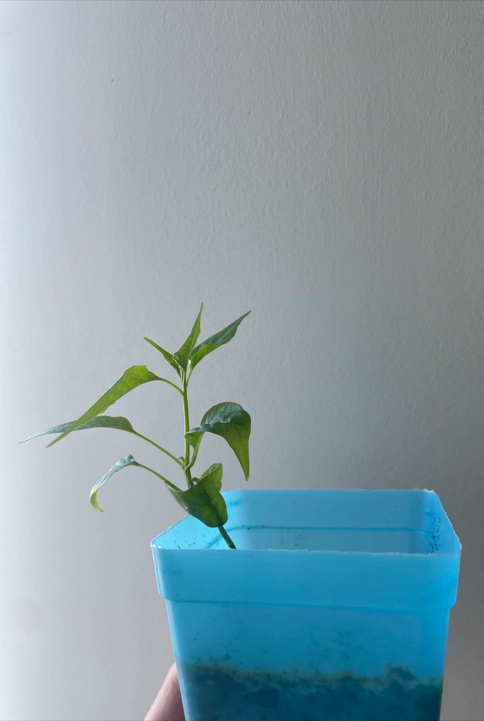 This is a young chilli pepper seedling. It's currently growing in a small blue pot and is showing healthy new growth. Perfect for starting your own pepper plants this season!