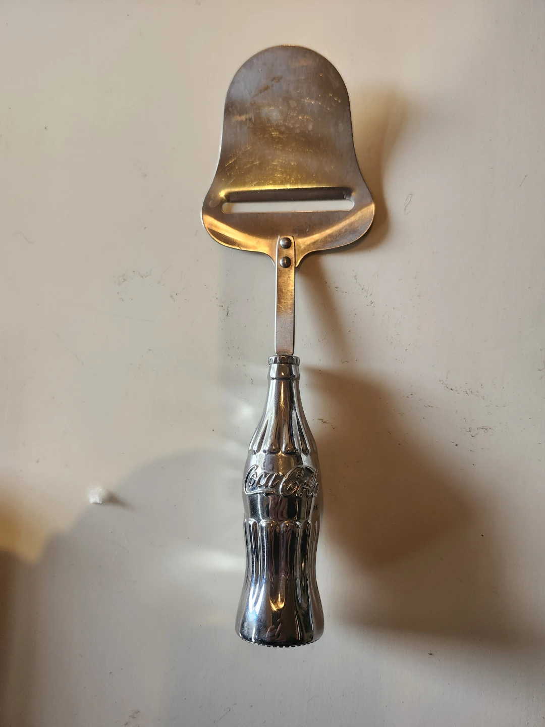 Here's a unique cheese slicer with a Coca-Cola bottle handle! It's in great shape and ready to slice some cheese. The handle is shaped like the classic Coca-Cola bottle, adding a fun touch to your kitchen tools