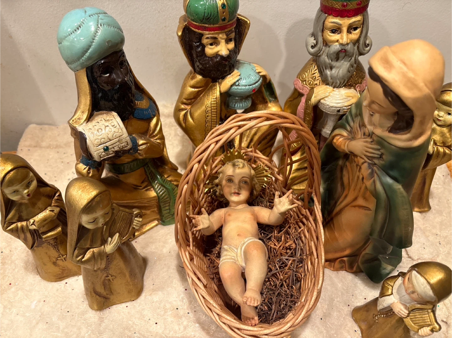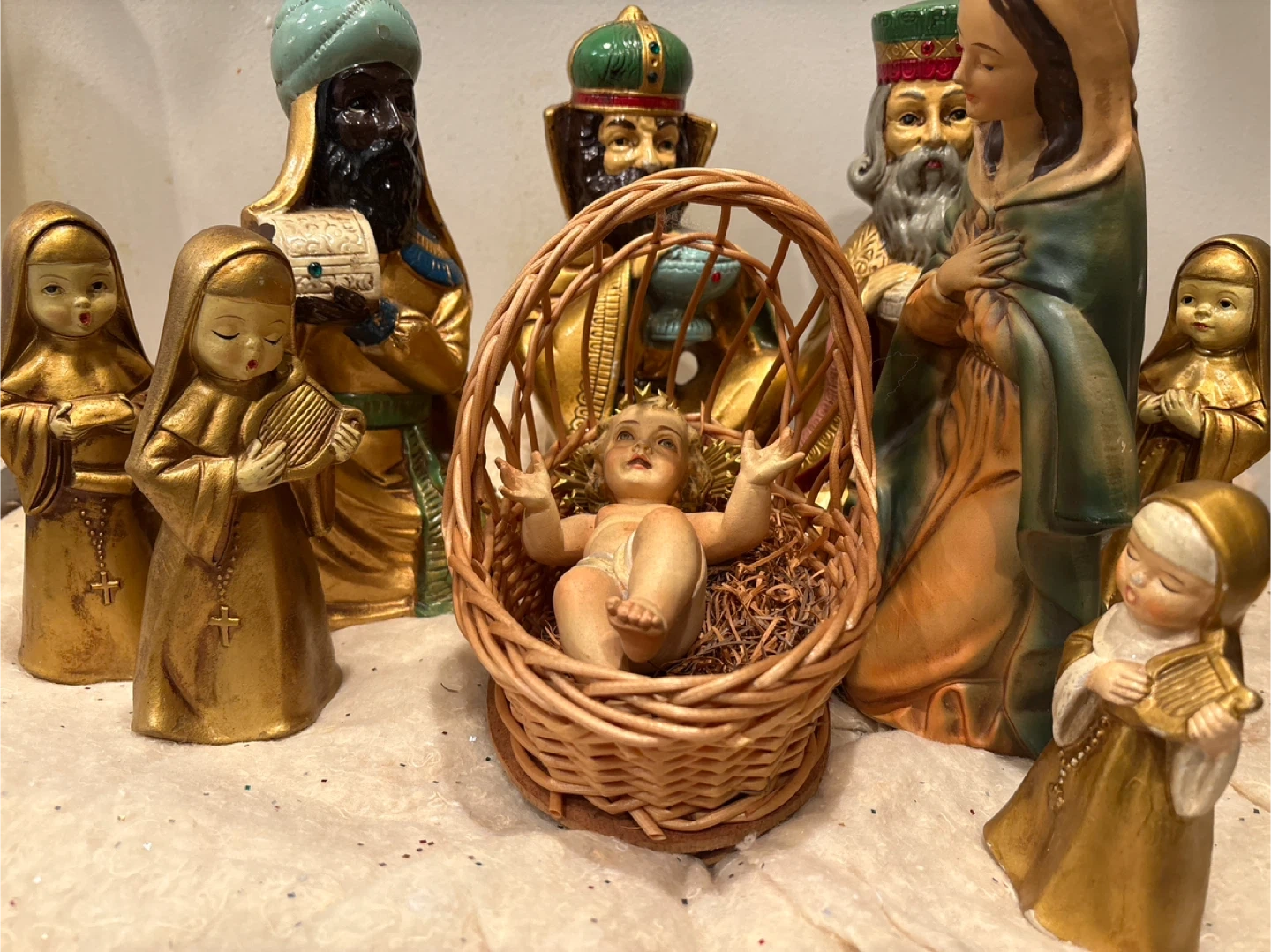 Selling a vintage Nativity Scene figurine set. The set includes baby Jesus in a basket, Mary, three wise men, and several nuns. The figurines are in good condition for their age