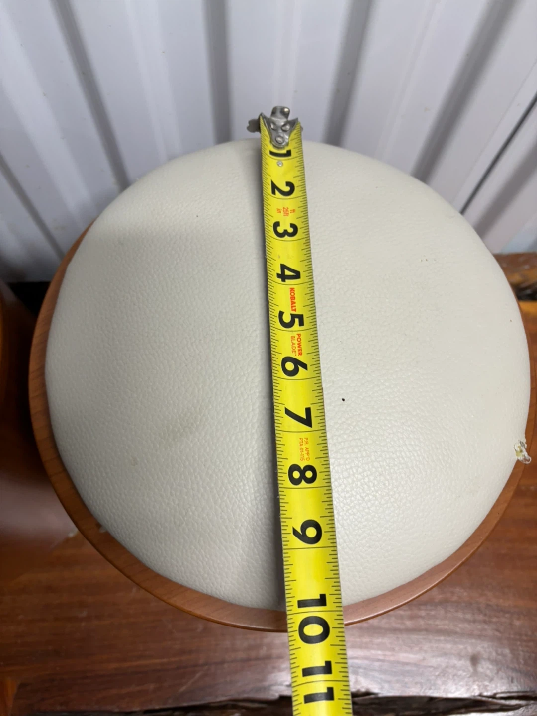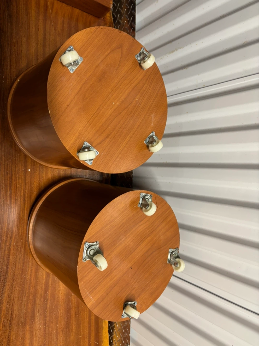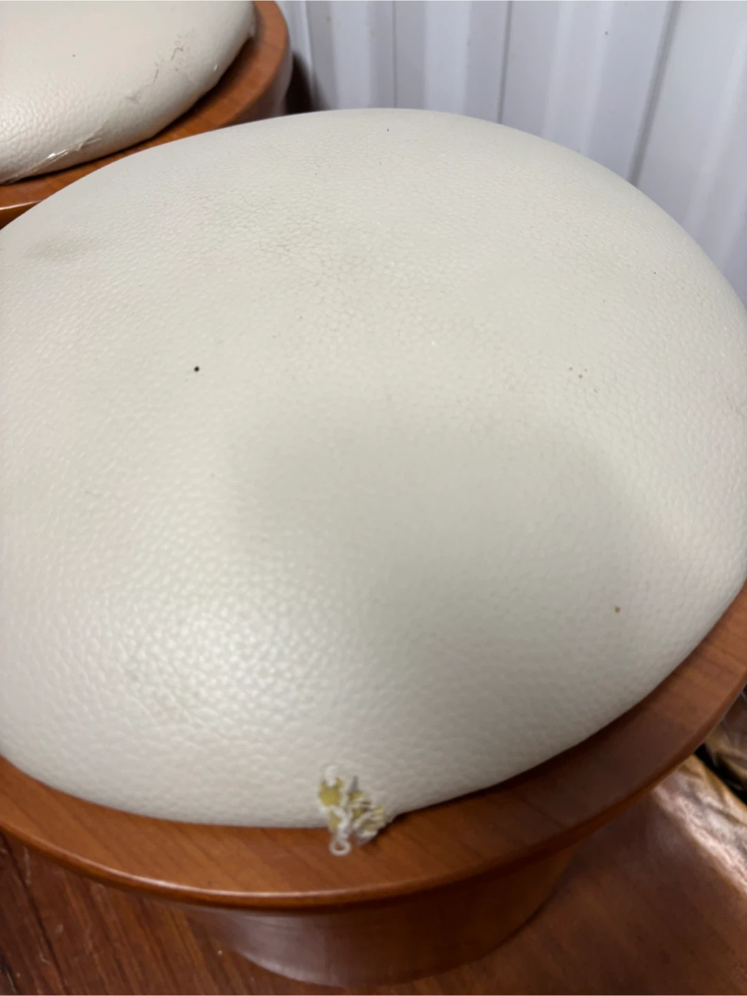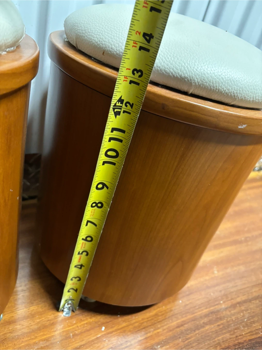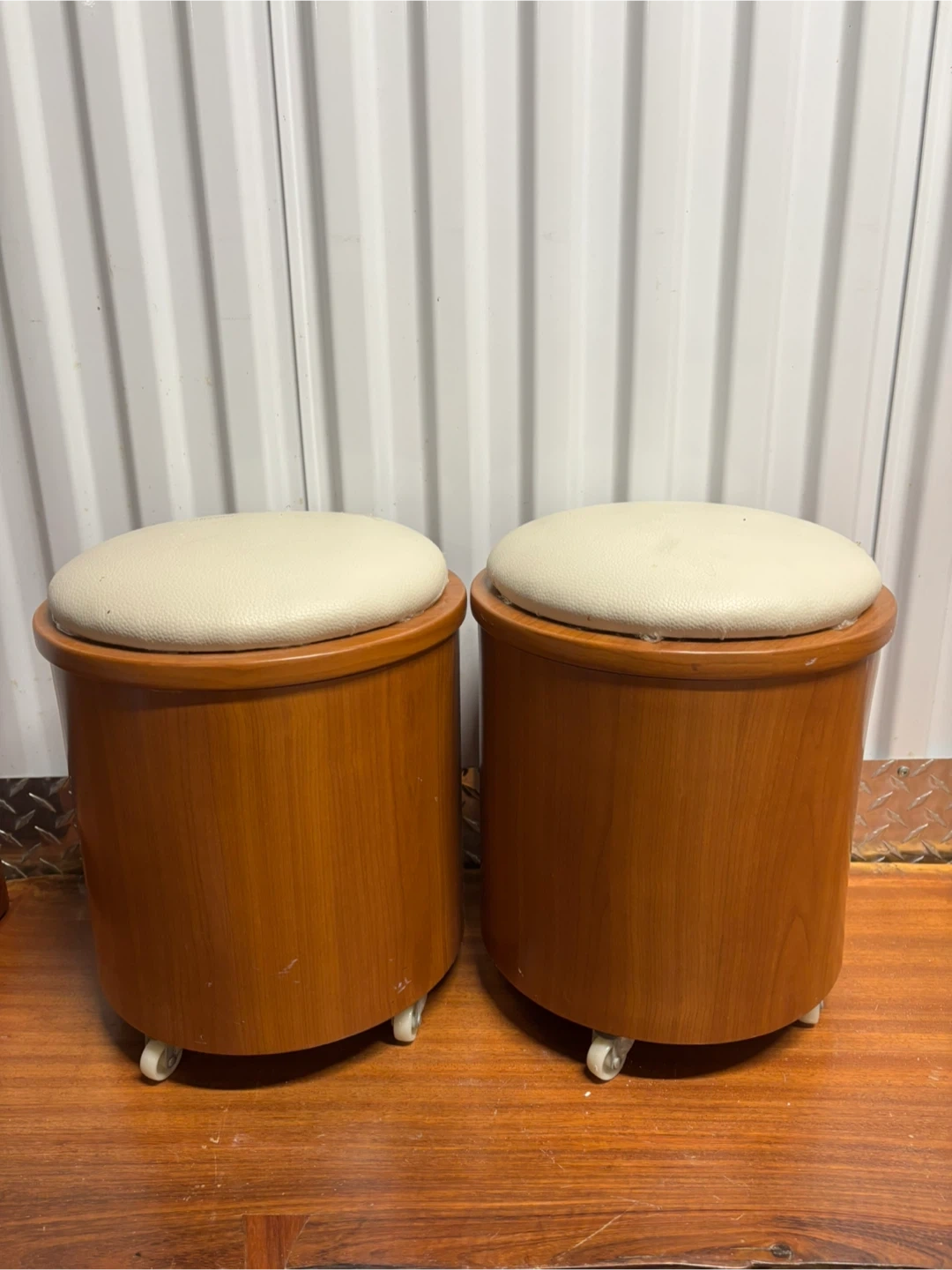 I have a pair of wooden stools with cream-colored padded tops for sale. They're on wheels, making them easy to move around. They are about 10 inches in diameter and 14 inches tall. One of the stools has a small tear in the cream padding.