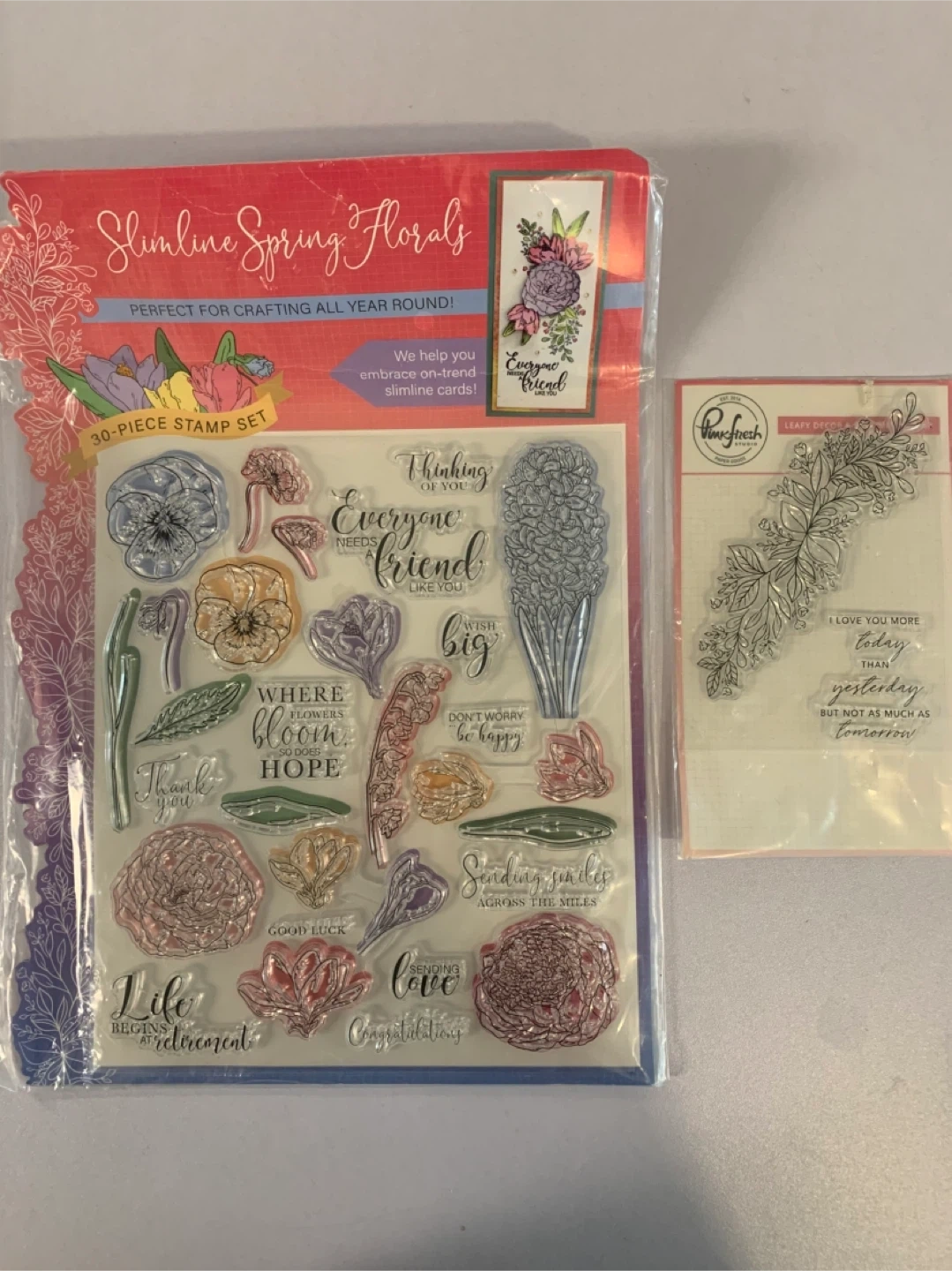 Two stamp sets for your crafting needs! One is a Slimline Spring Florals 30-piece stamp set, perfect for crafting all year round and for on-trend slimline cards. The other is a Leafy Decor stamp set from Pinkfresh Studio. Both are in excellent condition and ready for your next project