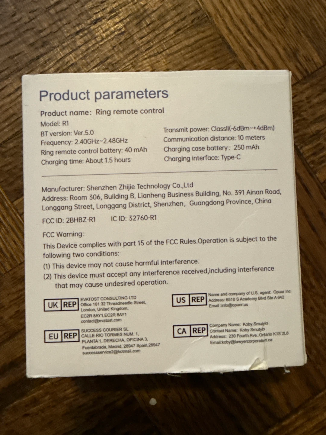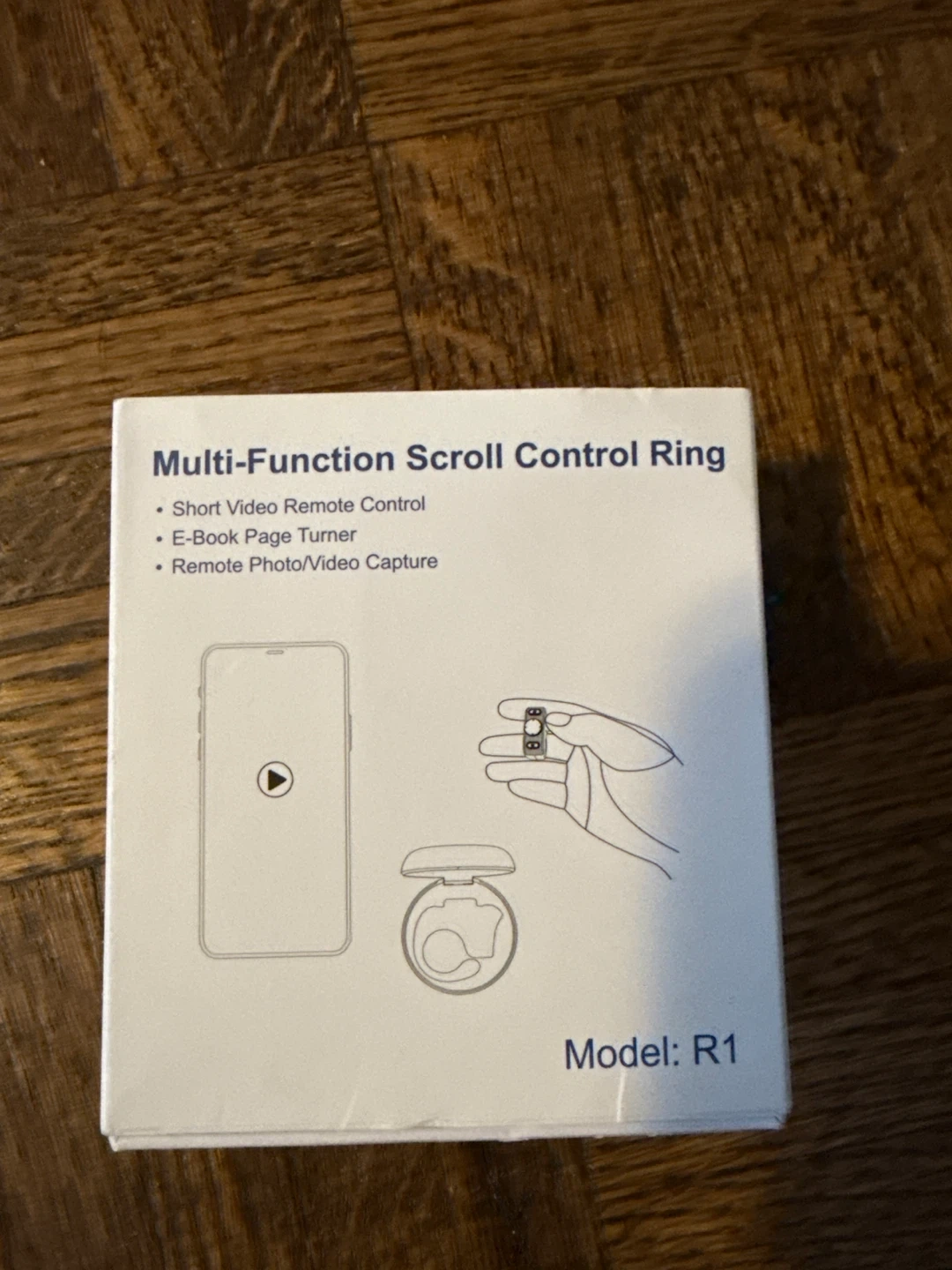 Selling a Ring Remote Control, model R1. It's a multi-function scroll control ring that can be used for short video remote control, e-book page turning, and remote photo/video capture. The charging case battery is 250 mAh, and it charges via Type-C.