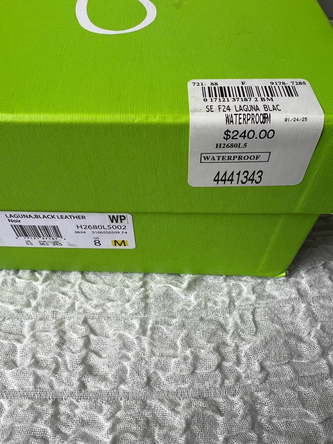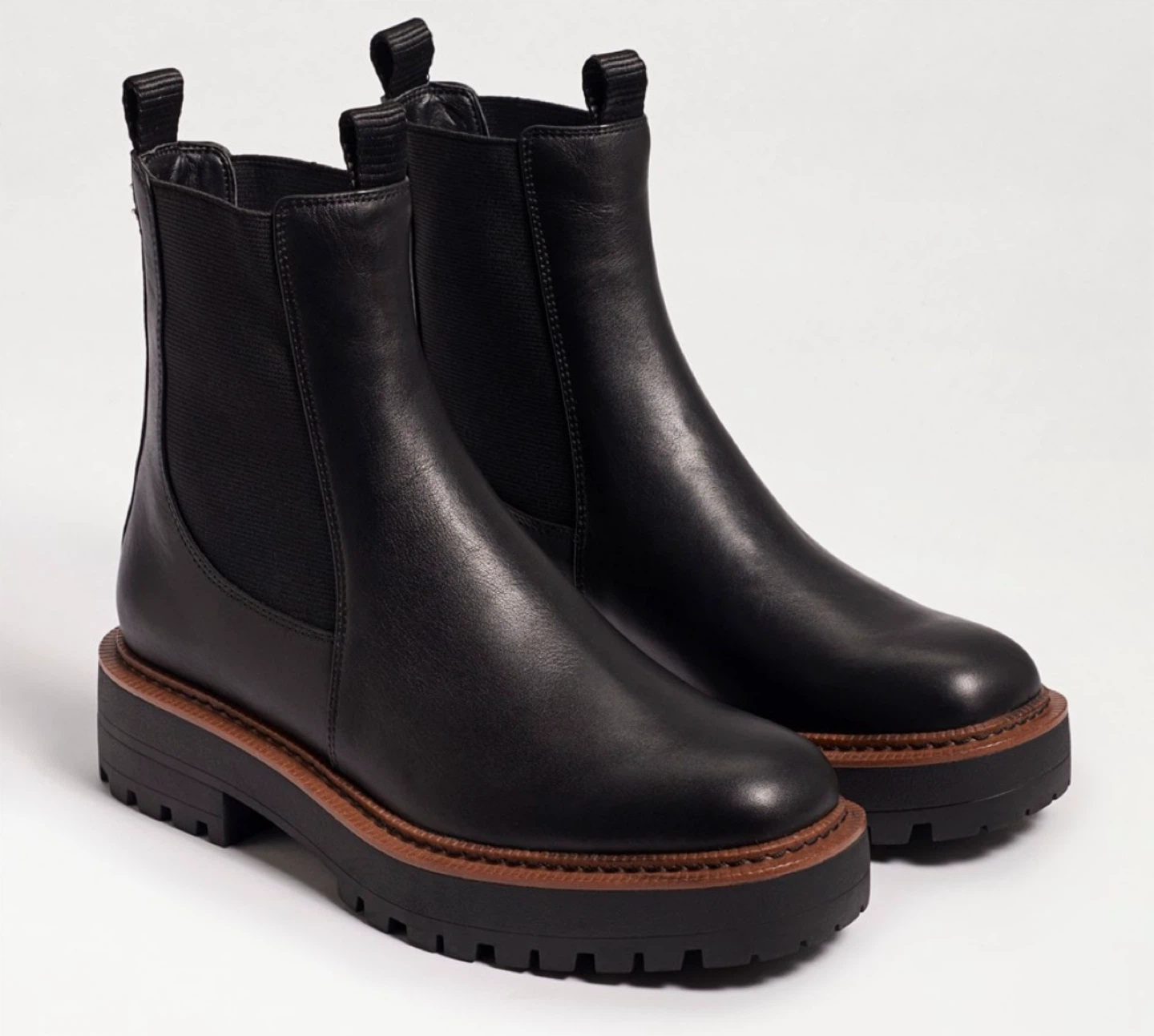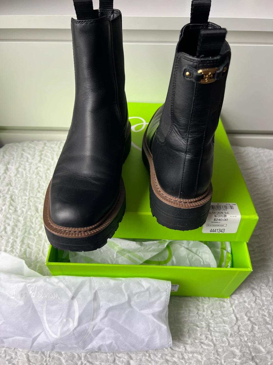 New pair of waterproof Sam Edelman Chelsea boots in black leather, size 8. They come in the original box, linen storage bag and packing paper. Made of leather upper with a waterproof construction, these cold weather pull-on booties have a square toe design, elastic gore insets for a snug fit, convenient pull tabs at front and rear, signature monogram plaque at the rear, and a durable rubber lugged outsole with sturdy block heel.