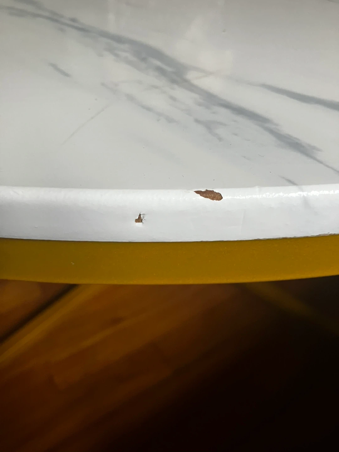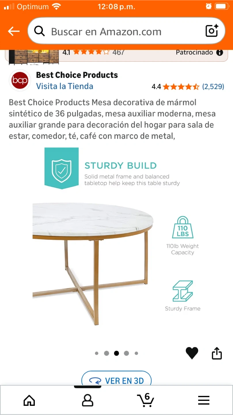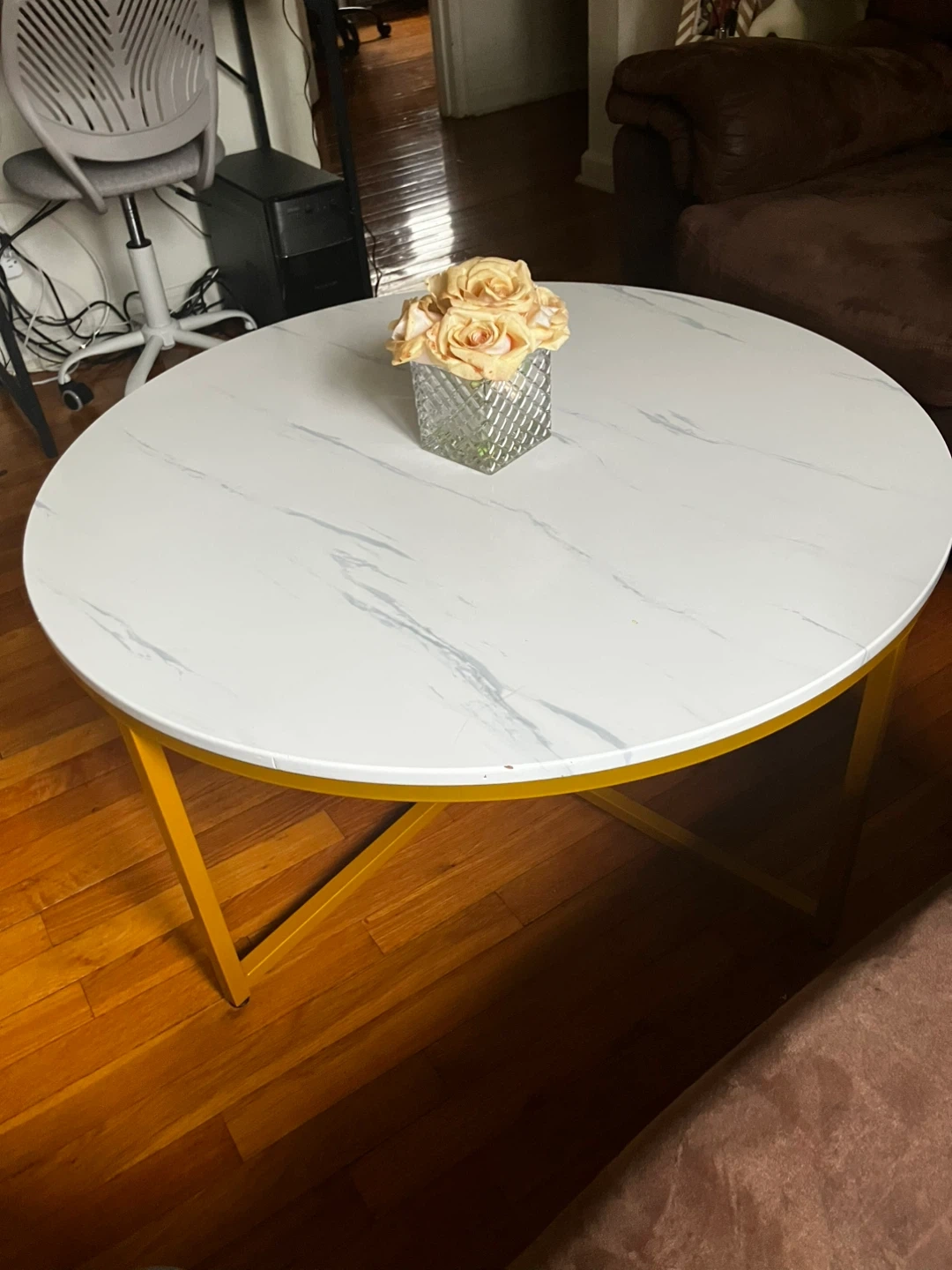 Selling a Best Choice Products coffee table with a marble-style top and gold-colored legs. It's a stylish piece for any living room or seating area! There are some minor imperfections on the edge of the table top.