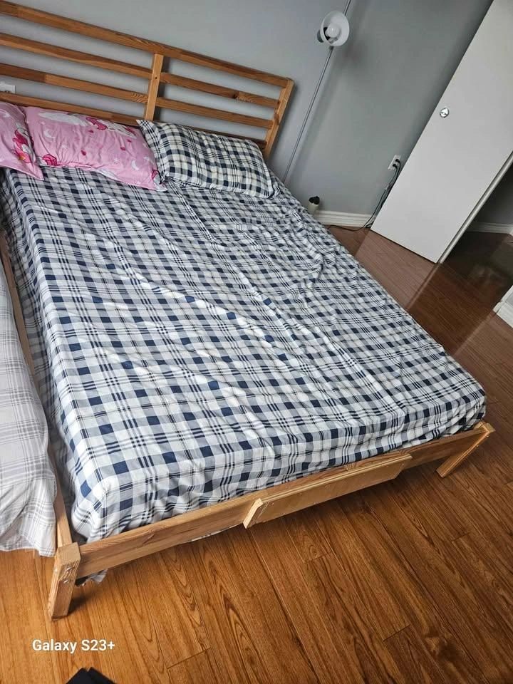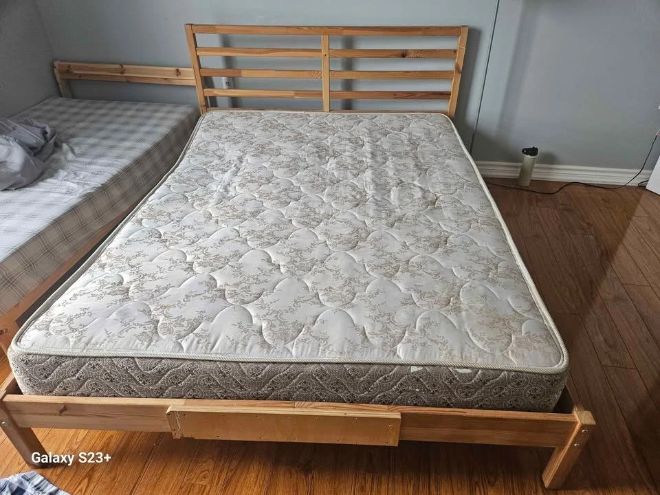 Selling a wooden bed frame with a mattress. It's in good condition and ready for a new home. The frame is sturdy and the mattress is comfortable for a good night's sleep