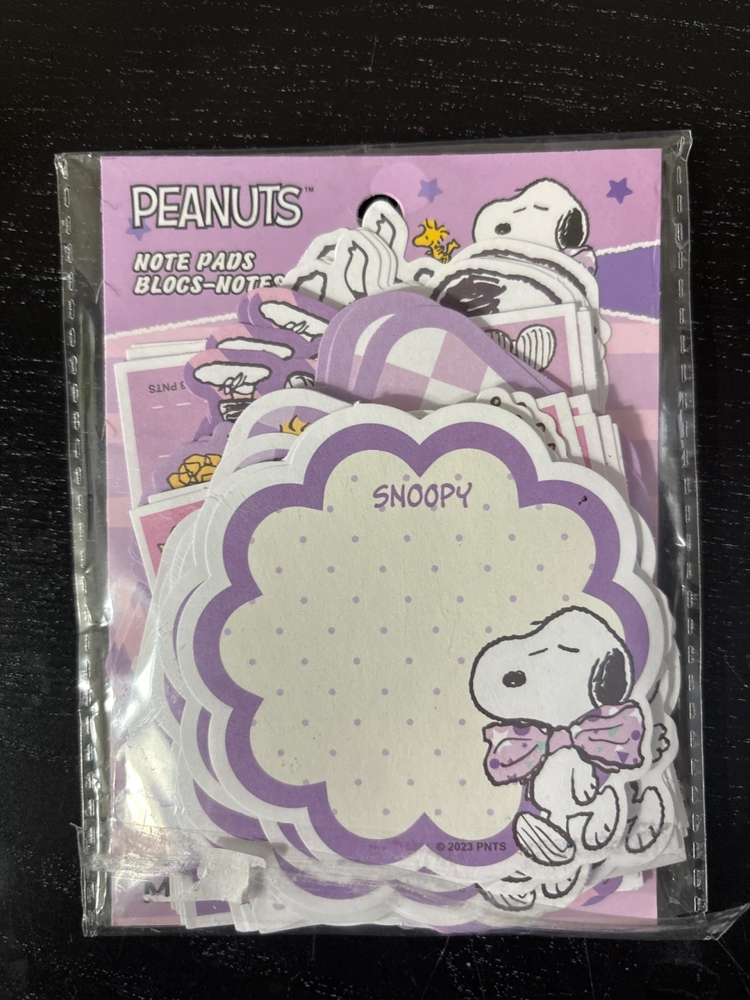 I'm selling a brand new package of Miniso Peanuts Snoopy note pads! The package includes a variety of cute Snoopy-themed note pads, perfect for adding a touch of fun to your notes and reminders. The material is paper.