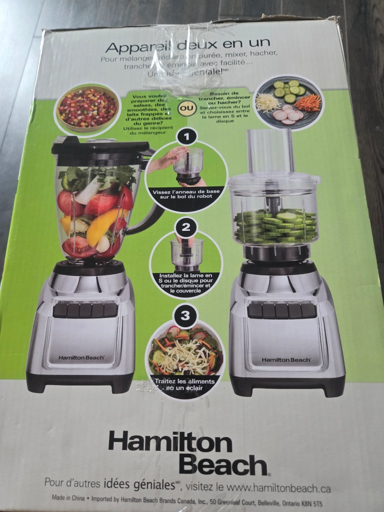 Selling a Hamilton Beach MultiBlend Mélangeur et Robot de Cuisine. It's a 2-in-1 appliance that can mix, reduce to puree, chop, slice, and mince with ease. It has a 700-watt peak power. The container and blades are dishwasher safe.