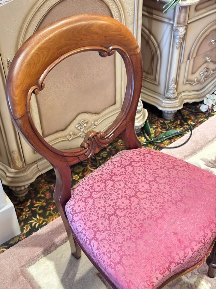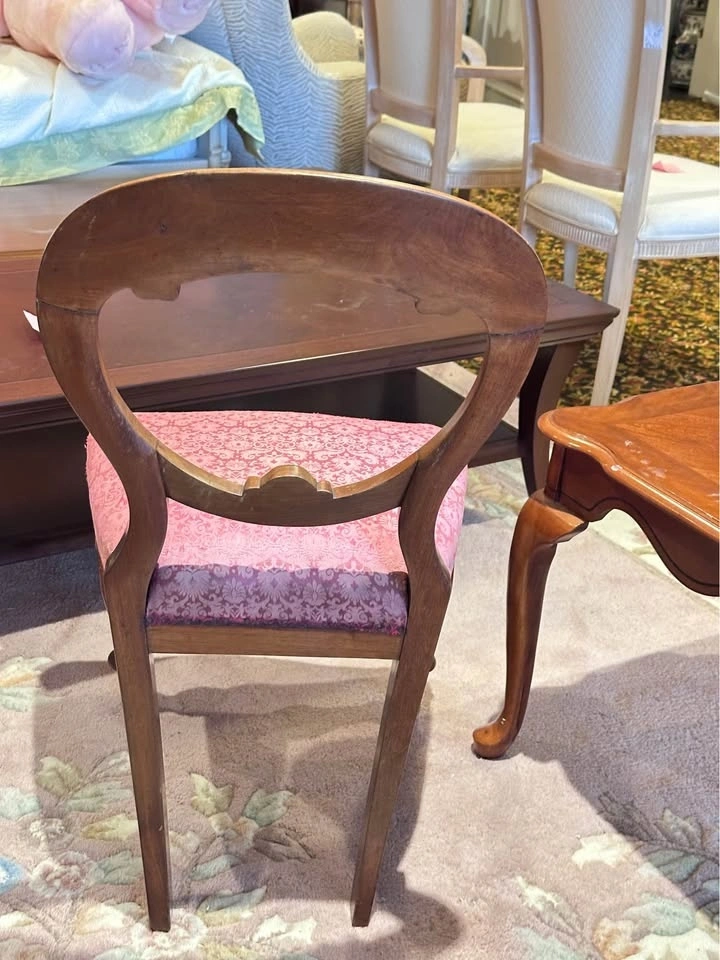 Vintage wooden accent chair with a beautifully curved frame and soft peach-colored upholstery. Elegant and classic, it adds a warm decorative touch to any room.