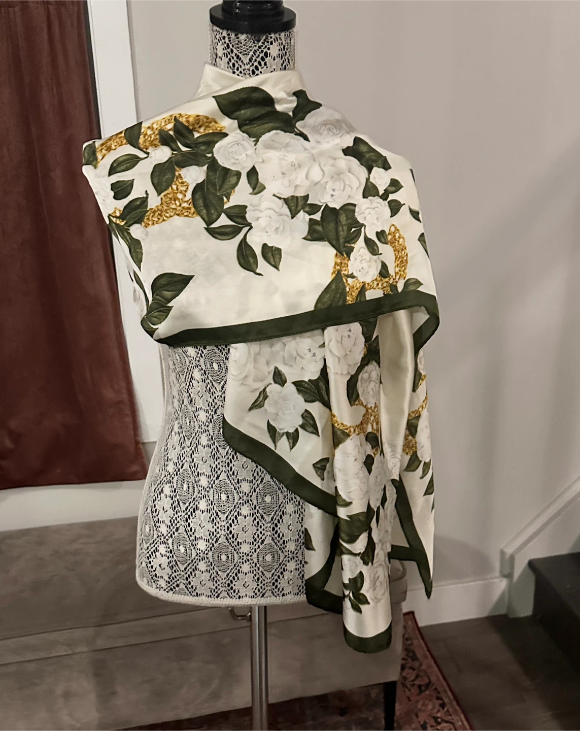 Selling a beautiful scarf with a floral print! The scarf features white flowers, green leaves, and gold chain accents on a cream background. The edges are trimmed with a dark green border.
