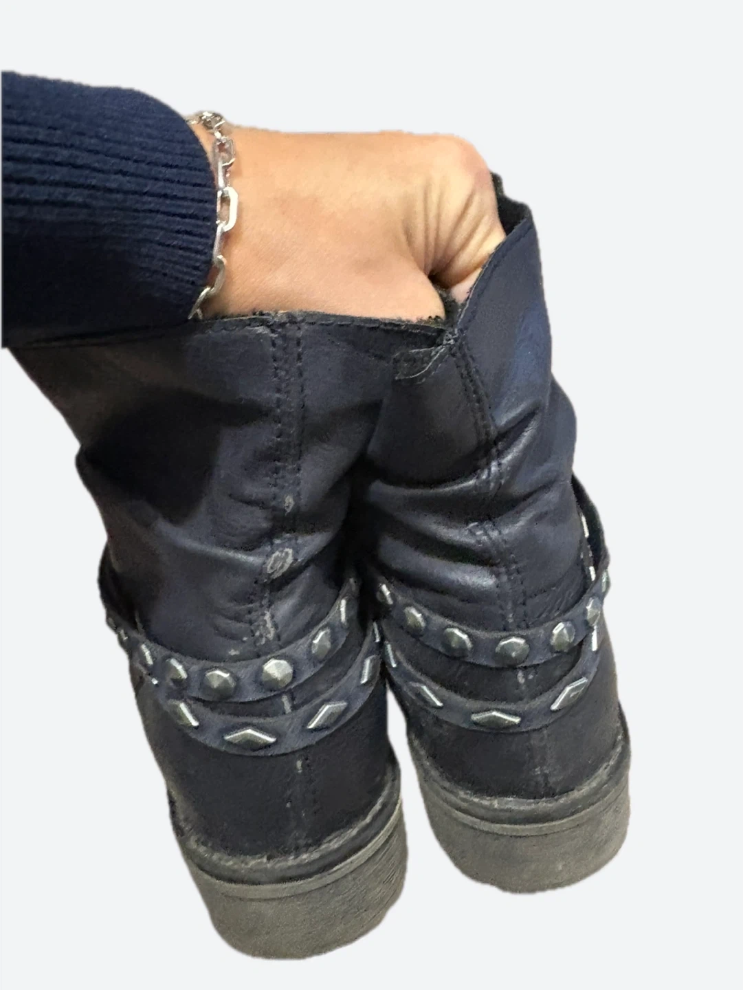 These are a pair of black leather ankle boots with some cool studded detailing! They have a zipper and buckle closure, giving them a bit of an edge. They're in good condition and ready for a new adventure. German brand Rieker .
