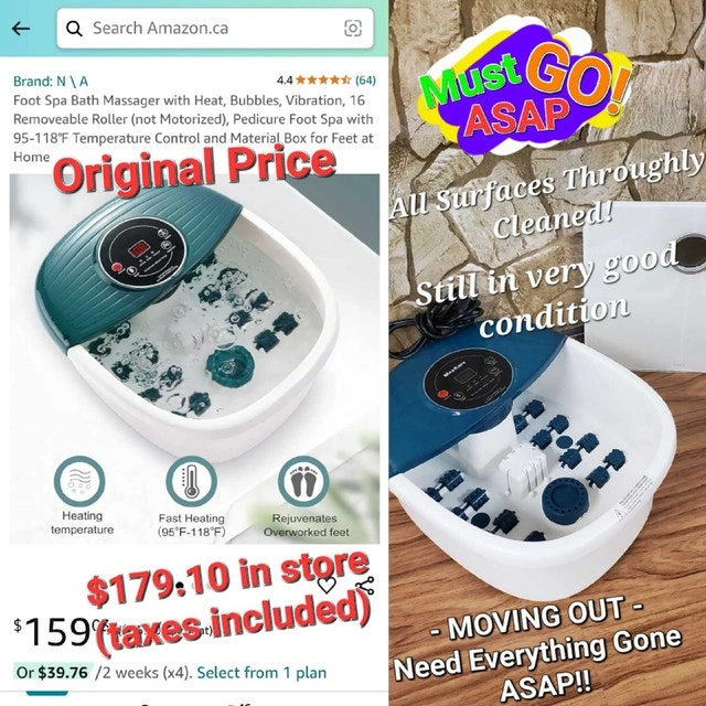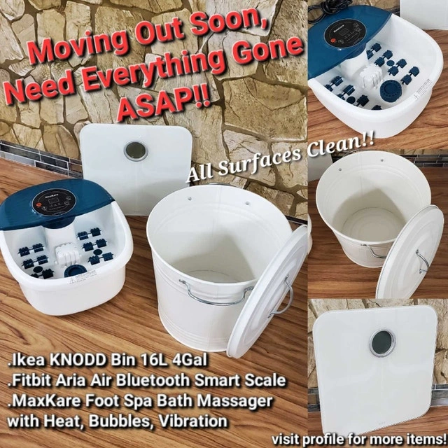 ➡️ I am selling a multi-item deal including a MaxKare Foot Spa Bath Massager with heat, bubbles, and vibration for a relaxing spa experience at home. The condition is still very good and all surfaces have been thoroughly cleaned. ✅️Features include: * Adjustable temperature control * Massage rollers * Bubble function * Vibration mode YouTube Video: https://youtu.be/kXtJxL6lSNc?si=7dGPh9tN2htj-rPb This used foot spa is priced to sell quickly! Based on similar listings on Kijiji, a reasonable price range is $40-$80. Get it now for a pampering treat without breaking the bank! Also included in the multi-item deal are an Ikea KNODD bin and a Fitbit Aria Air Bluetooth Smart Scale If the ad is still up, the item is still available! Please also check out my other listings. ( See Pictures for Dimensions ) ✅️ About Seller: ➡️ R&F Furniture and Appliances CLEARANCE SALES, Need Everything Gone ASAP!! [ Keep checking profile, more items on the way!! ] - Discounts apply when buying multiple items -Items can be inspected and tested prior to purchase - No deliveries, curbside pickup only - Leave a message and I'll get back to you as soon as I am available - Downtown Toronto, close to Roy Thomson Hall and TIFF Nearest main intersection at Adelaide Street West and John Street Condominium Building FREE PARKING AVAILABLE! #RFfurnitureandappliances #kettles #boilers #masterchef #chef #coffee #tea #warmer #heater #kitchenware #kitchen #utensils #barstools #chairs #recliners #kitchen #home #furniture #metalframe #black #stools #highchairs #tallchairs #kitchenisland #tables #dining #household #appliances #indoor #sales #clearance #trashbin #ikeaknodd #metal #waste #container #smartscale #bluetooth #scale