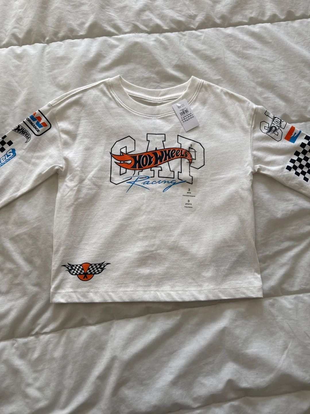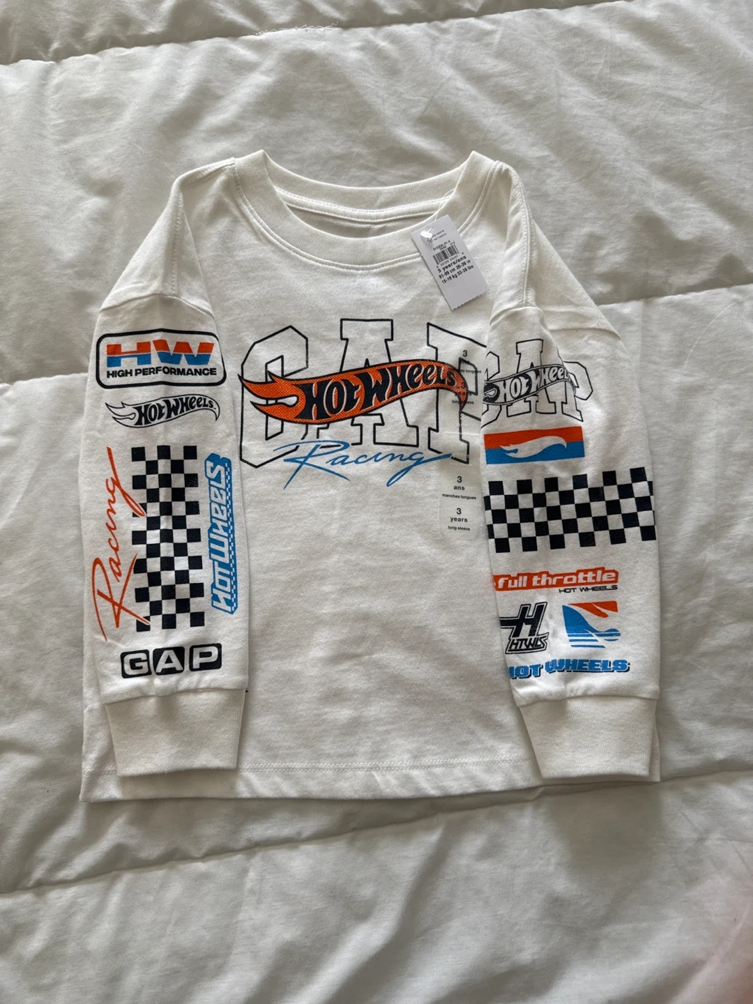 I'm selling a GAP long-sleeve shirt featuring a Hot Wheels Racing design. It's in great condition and perfect for a little racer! The size is 3 years.