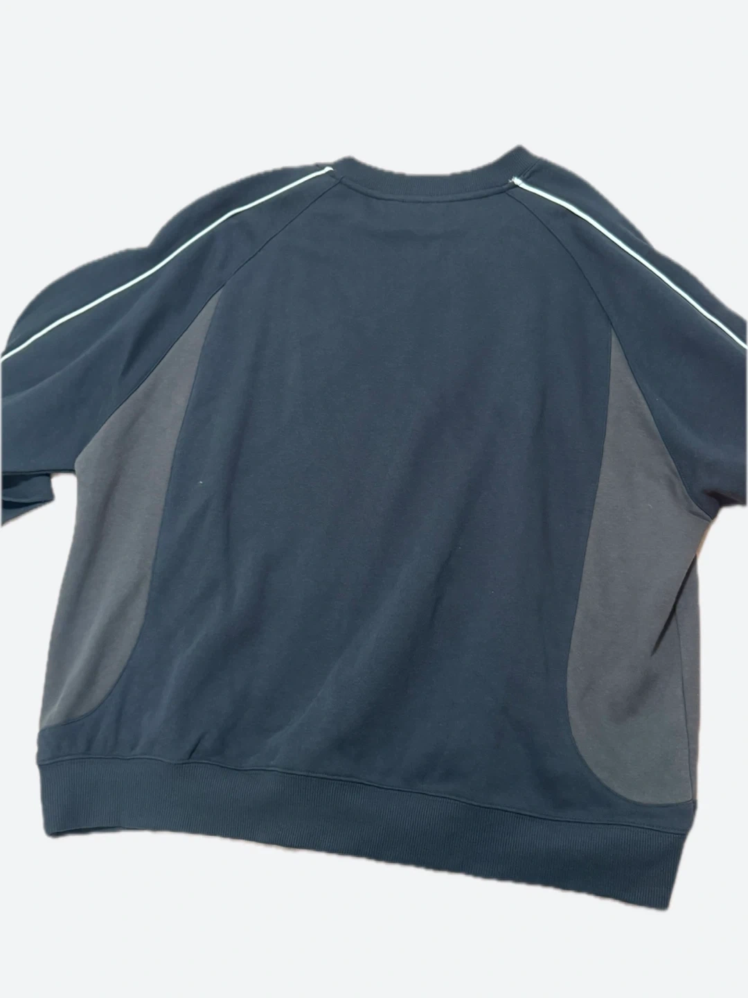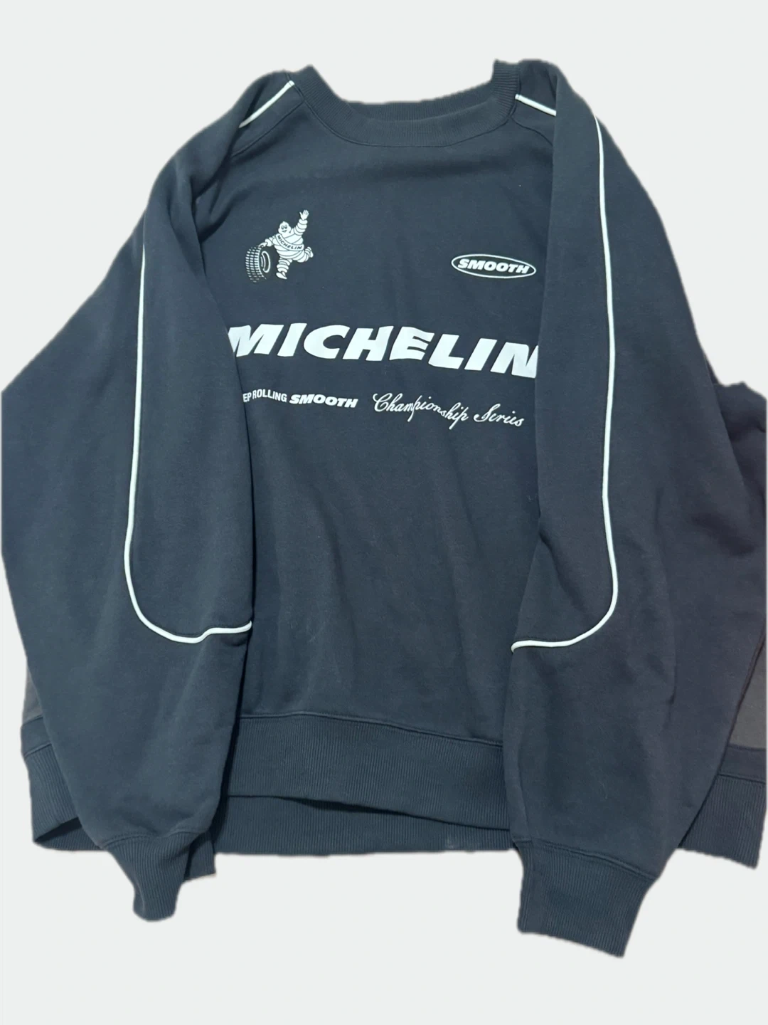 Selling a Michelin crewneck sweater in a dark grey colour. It has a white stripe design along the sleeves and the Michelin logo on the front. The material is soft and comfortable, perfect for everyday wear!