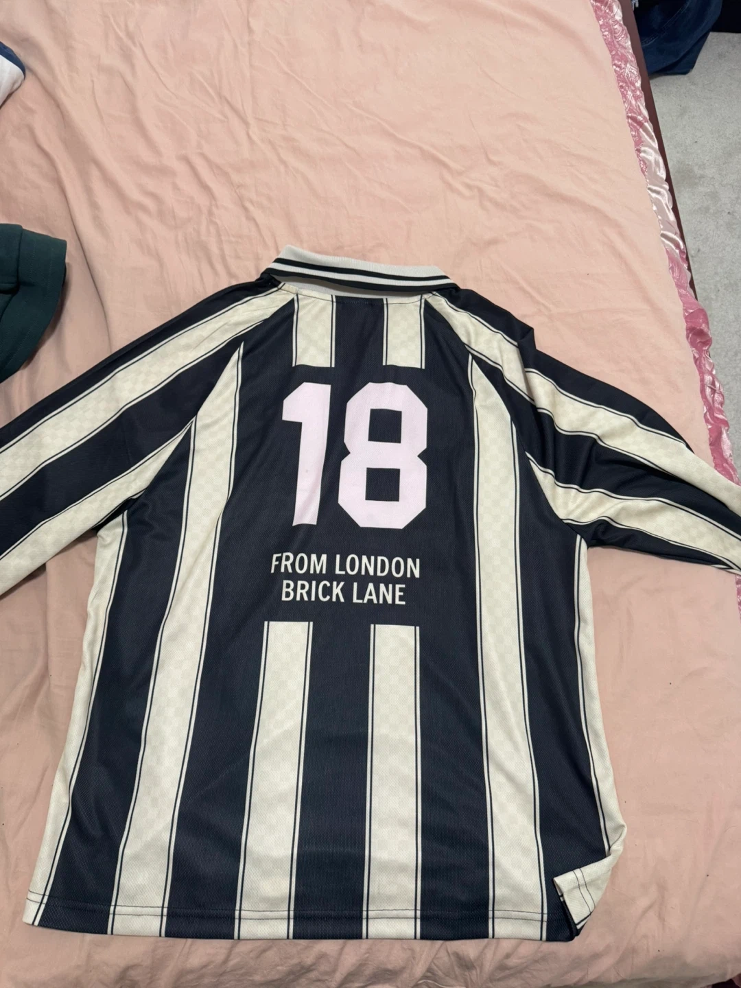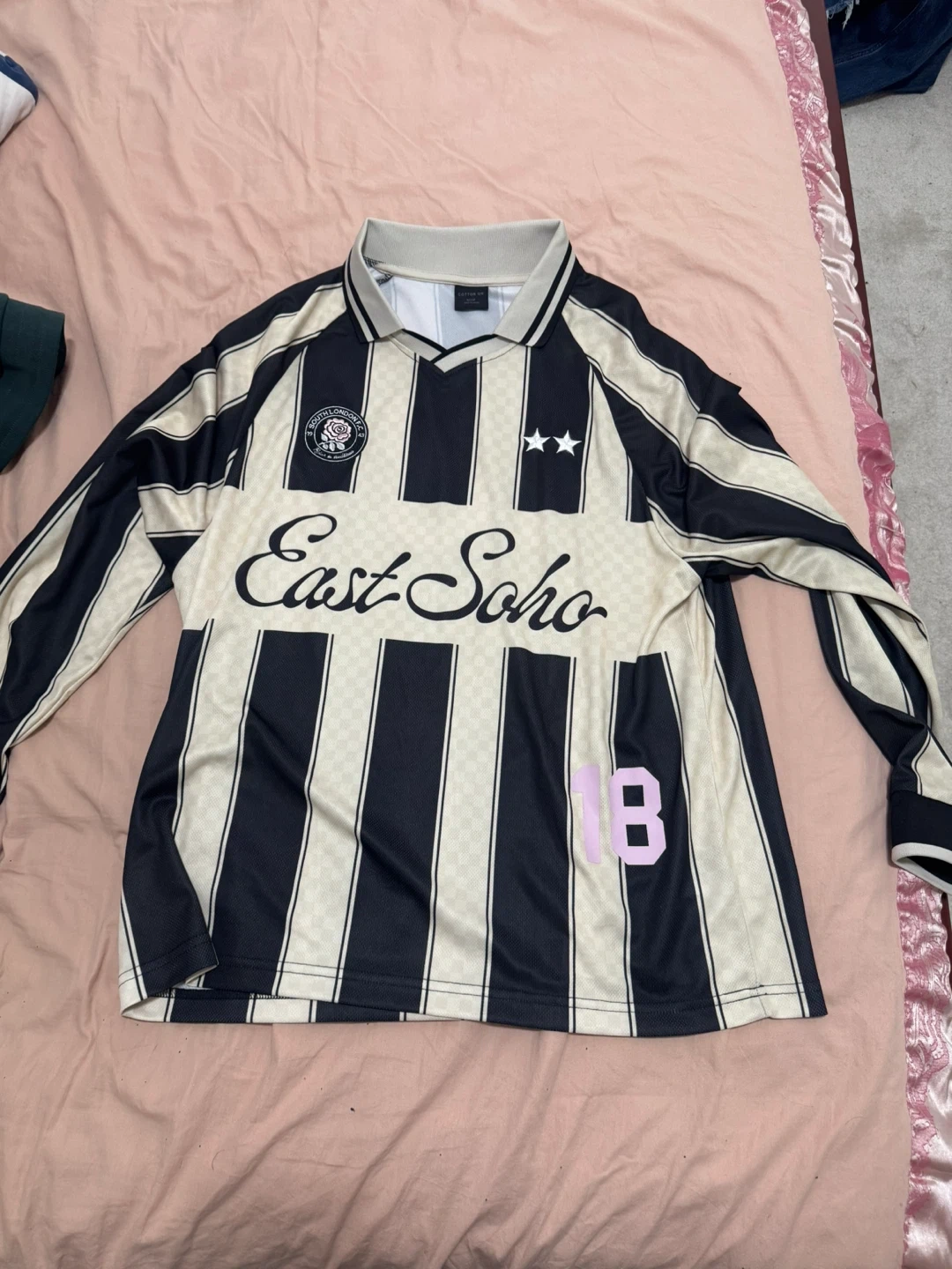 East Soho long sleeve jersey with a cool striped design! It's black and cream colour, with the words 'East Soho' across the front and the number 18 on the back. From London Brick Lane.