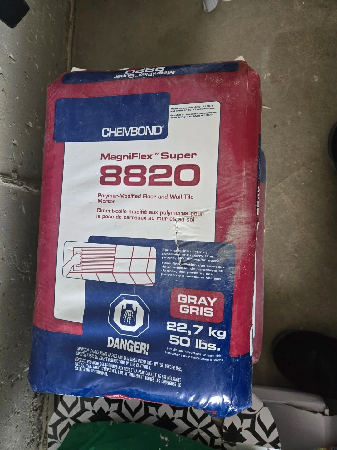 Selling a 3 bags of CHEMBOND MagniFlex™ Super 8820 Polymer-Modified Floor and Wall Tile Mortar. It's a 22.7 kg (50 lbs) bag, perfect for installing ceramic, porcelain, and quarry tiles, pavers, and dimension stone. Please read all safety instructions before use! $ 15each