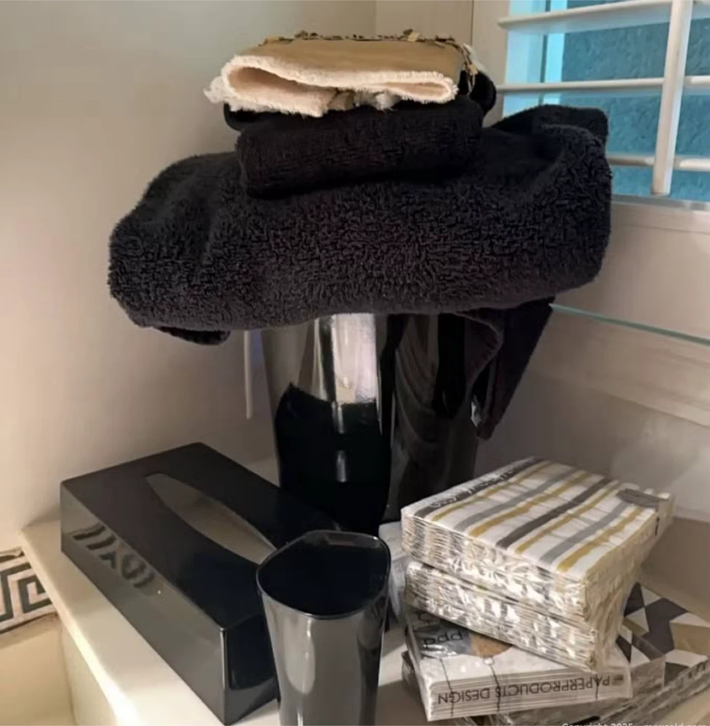 I have a black tissue box cover and a set of napkins for sale! They're in great condition and would look lovely in any bathroom or on a dining table