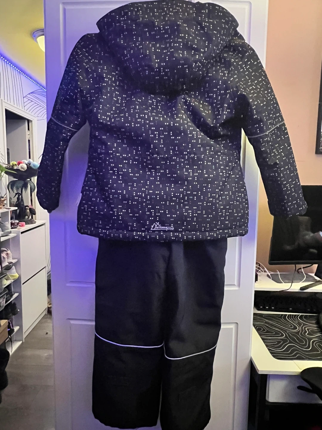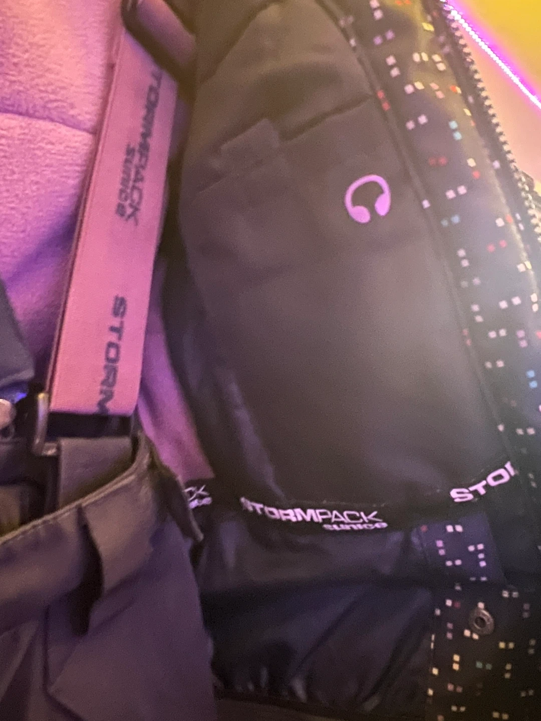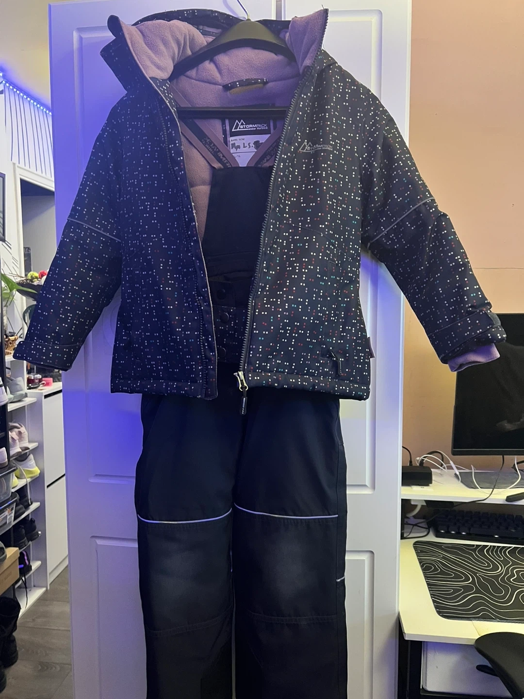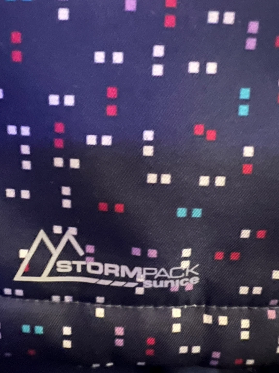 Selling a Stormpack Sunice ski jacket and pants set in size 6. The jacket has a fun pattern, and the pants are a solid dark blue with white trim. Perfect for school and for hitting the slopes this winter!