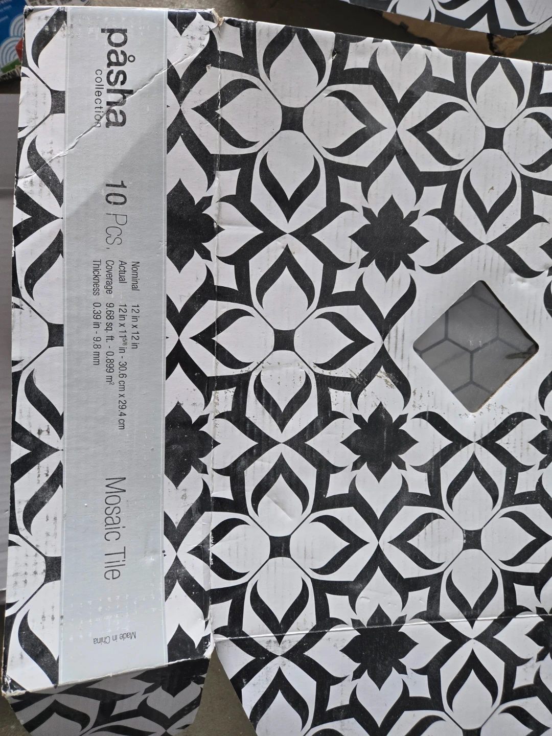 Selling 14 pives of Pasha Collection Mosaic Tile. The box includes 10 pieces of hexagon-shaped tiles. Each tile measures approximately 12 in x 12 in, covering 9.68 sq ft. The thickness of each tile is about 0.39 in.