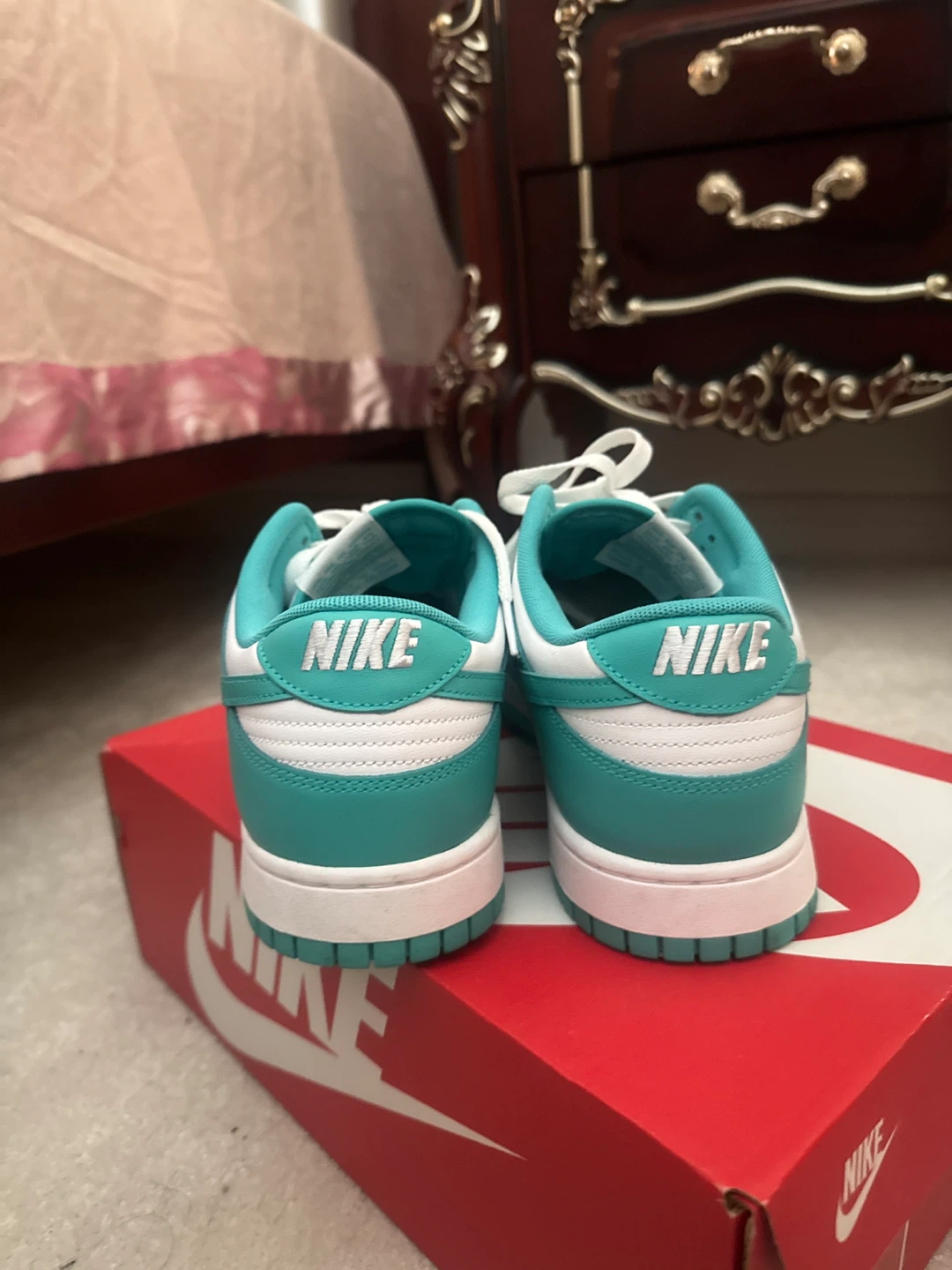PRICE IS NEGOTIABLE ‼️Selling a pair of Nike Dunk Lows in a cool teal and white colourway! They come with the original box. These are in great condition, ready for a new owner!