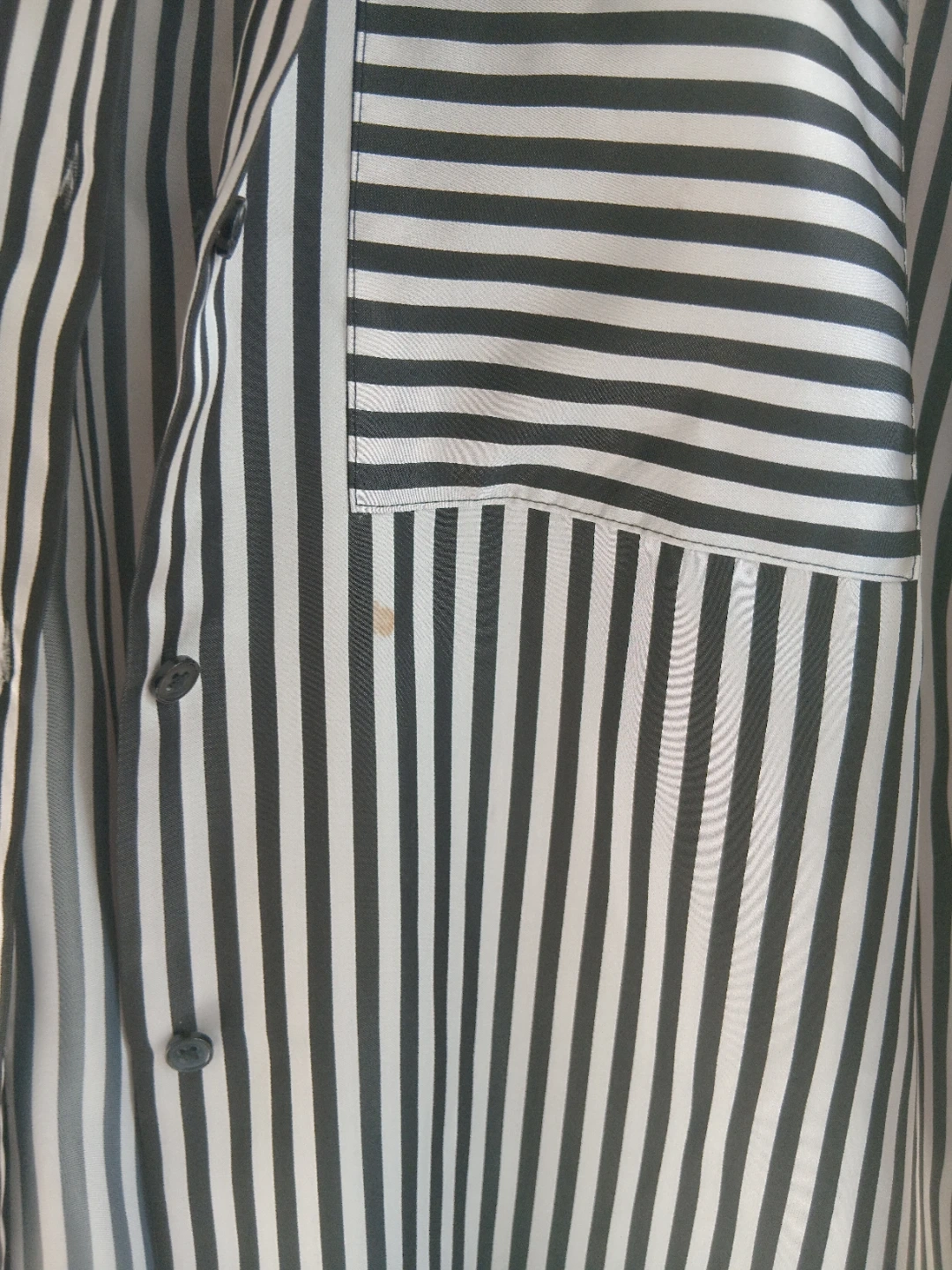 Here's a Banana Republic Dillon shirt in size S! It features a stylish black and white striped pattern. There's a small stain on the pocket, as shown in the picture.