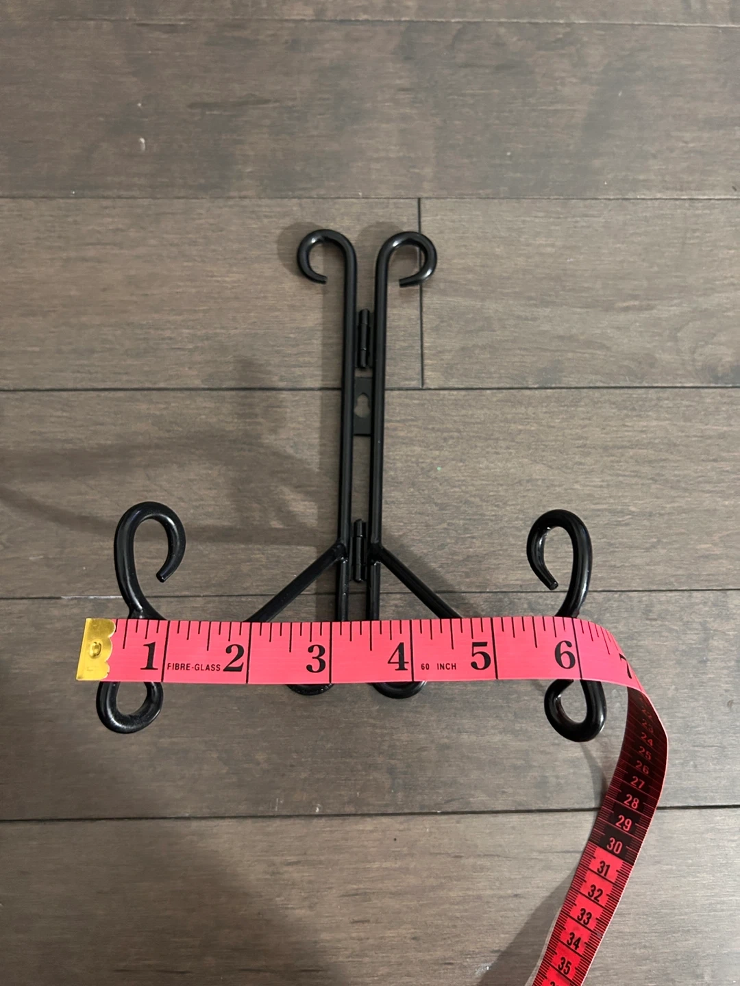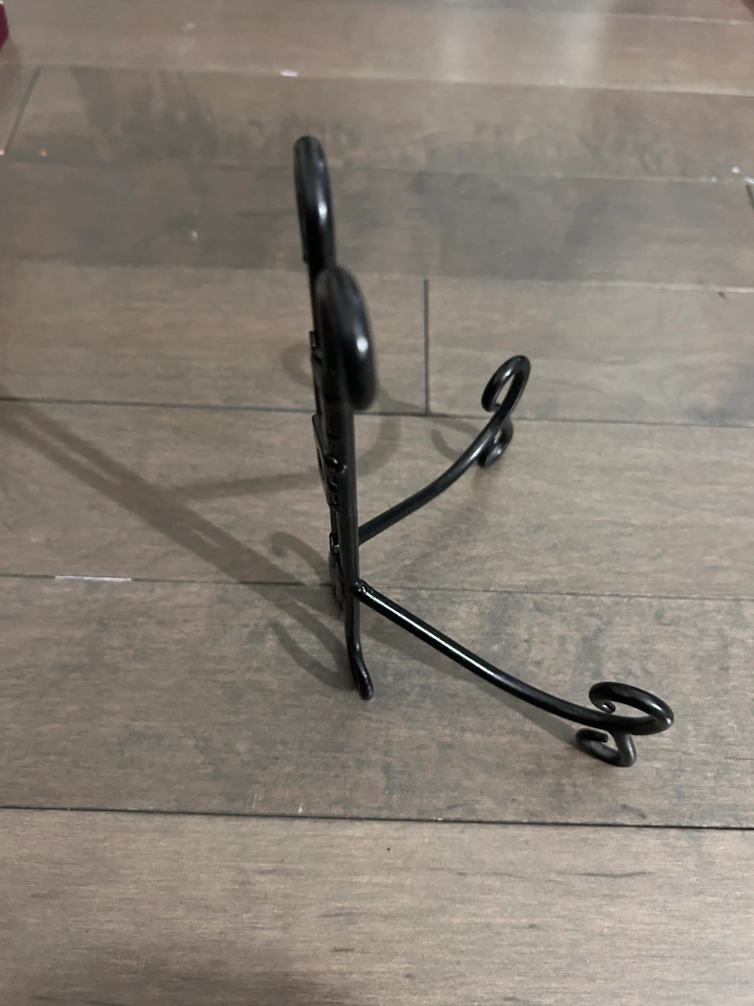 Selling a sturdy black metal easel stand! It's in great shape and perfect for displaying pictures, plates, or small artwork. It measures approximately 11 inches tall and 6 inches wide.