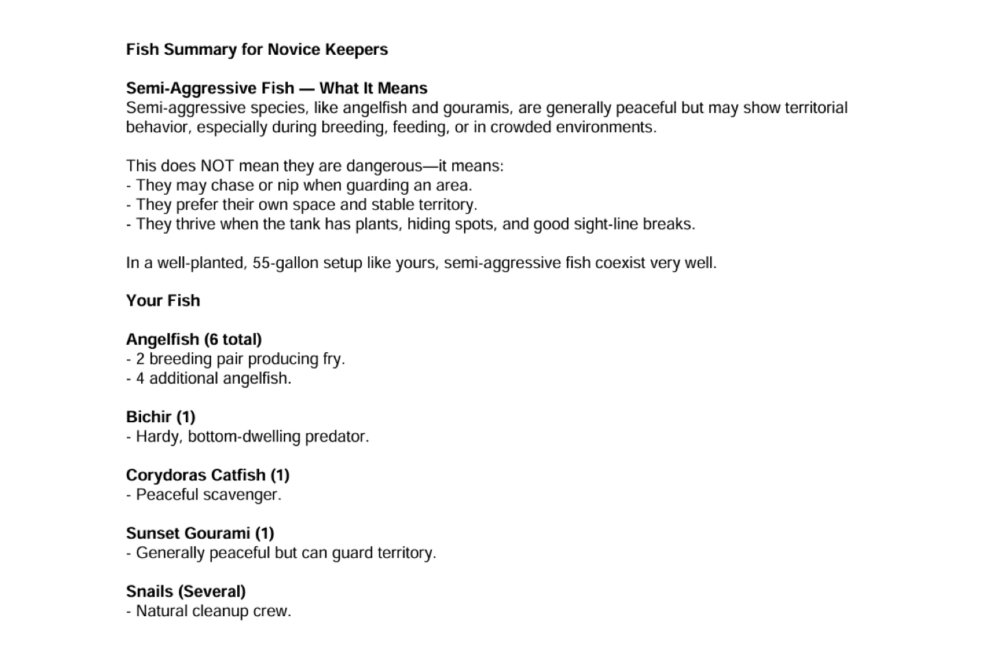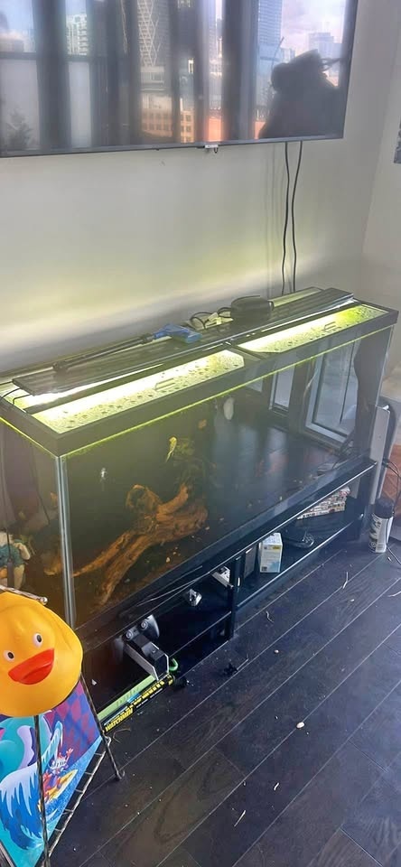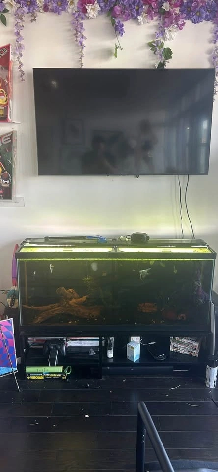 Fully established 55-gallon freshwater aquarium, measuring 13” deep × 20” high × 48” wide. Comes complete with all essential equipment and décor, including a high-quality filtration system, LED lighting, secure lid, pumps, and air system. Also includes aquarium chemicals, food, and a breeder box for optional use. The tank features premium natural materials — petrified wood (valued at $80) and three lava stones (valued at $100) — creating a beautiful, balanced aquascape.