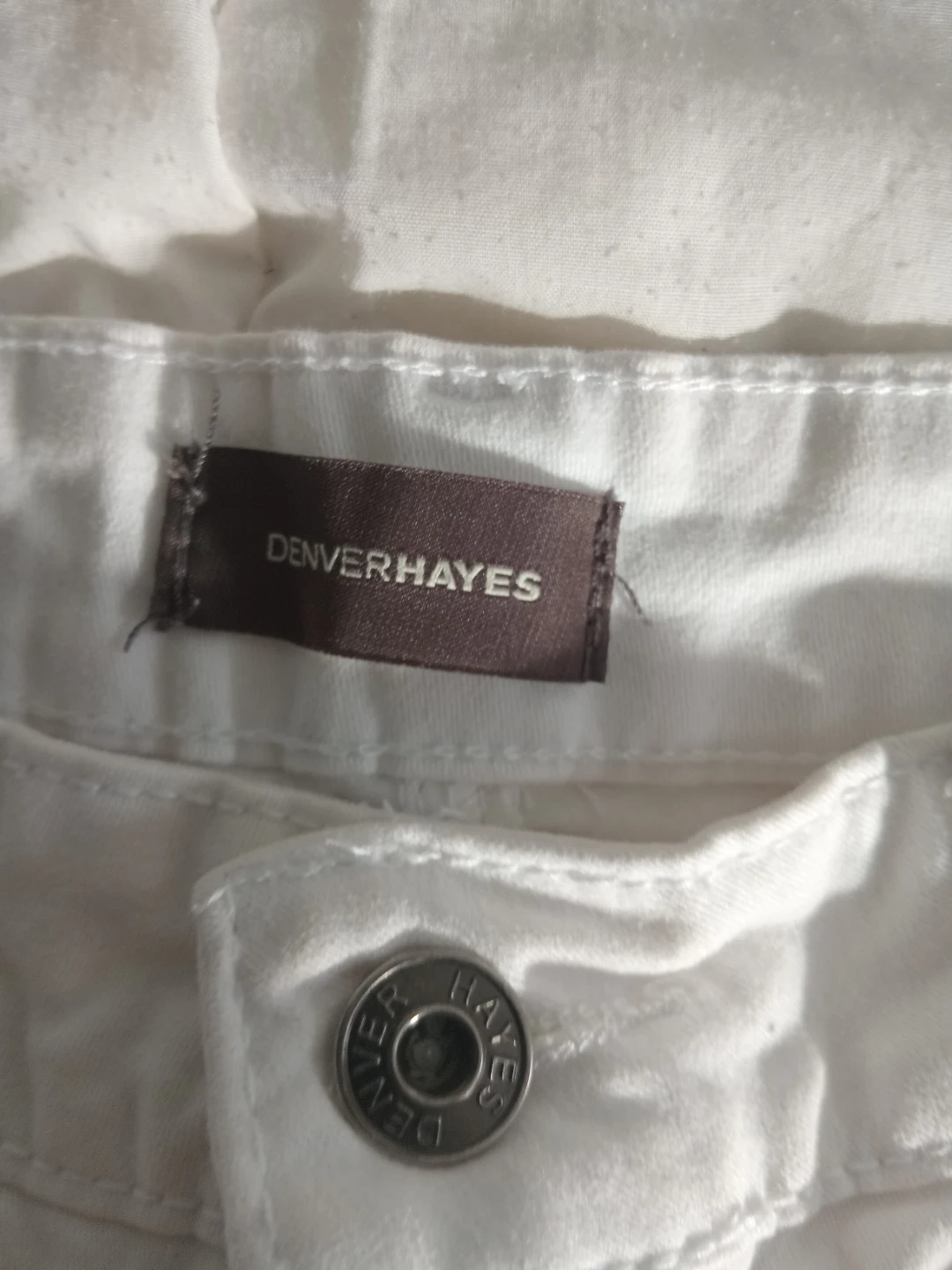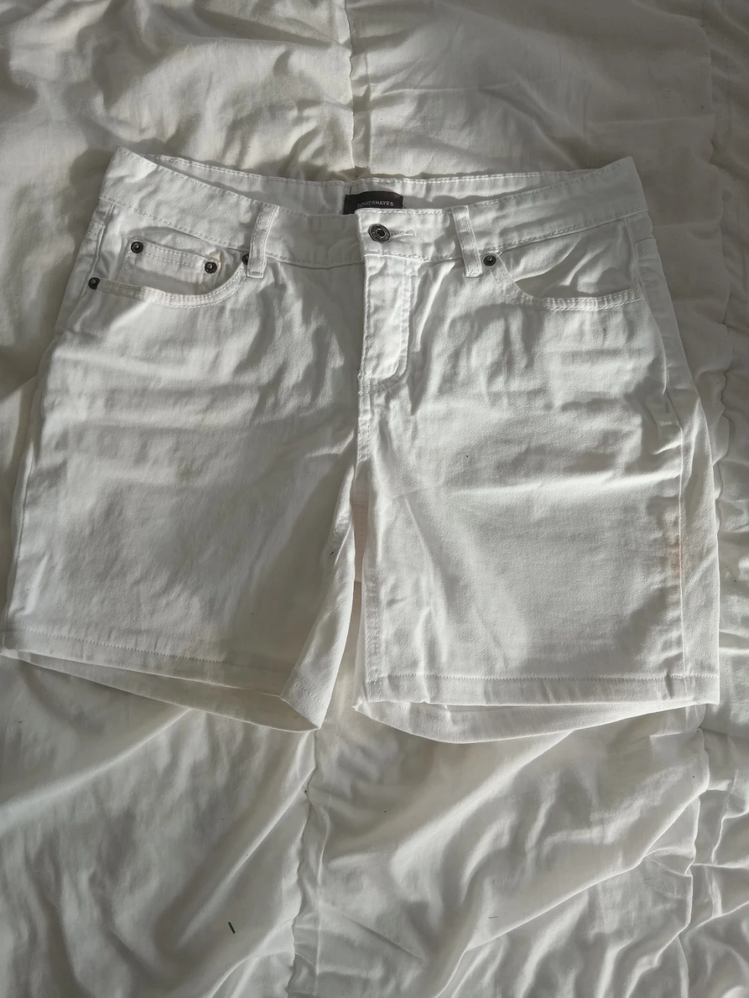 Selling a pair of white Denver Hayes shorts in size 6. These shorts have a 'Curve-Tech' design. They're made of 98% cotton and 2% spandex. There is a stain on the side of the shorts.