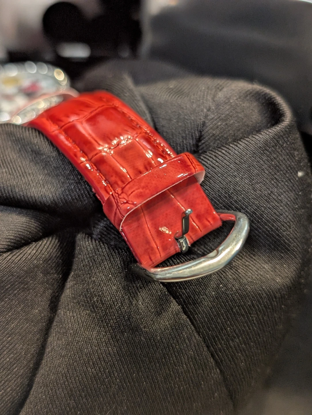 This adorable Disney watch features Mickey and Minnie Mouse on the face, surrounded by sparkling accents. It has a vibrant red, faux-crocodile leather band and cute "I love U" charms. The back casing specifies a Japan movement and the watch requires a 377 battery.