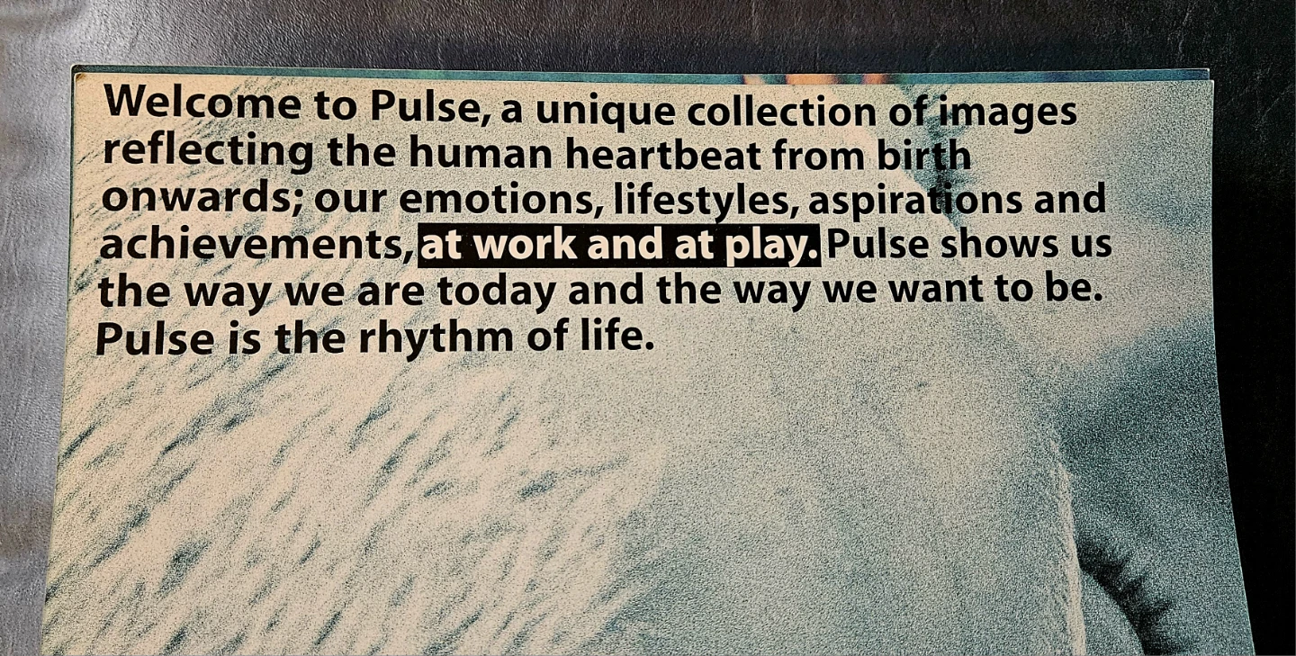 I'm selling a book called Pulse. It's a unique collection of images reflecting the human heartbeat from birth onwards; our emotions, lifestyles, aspirations and achievements, at work and at play. Pulse shows us the way we are today and the way we want to be. Pulse is the rhythm of life.