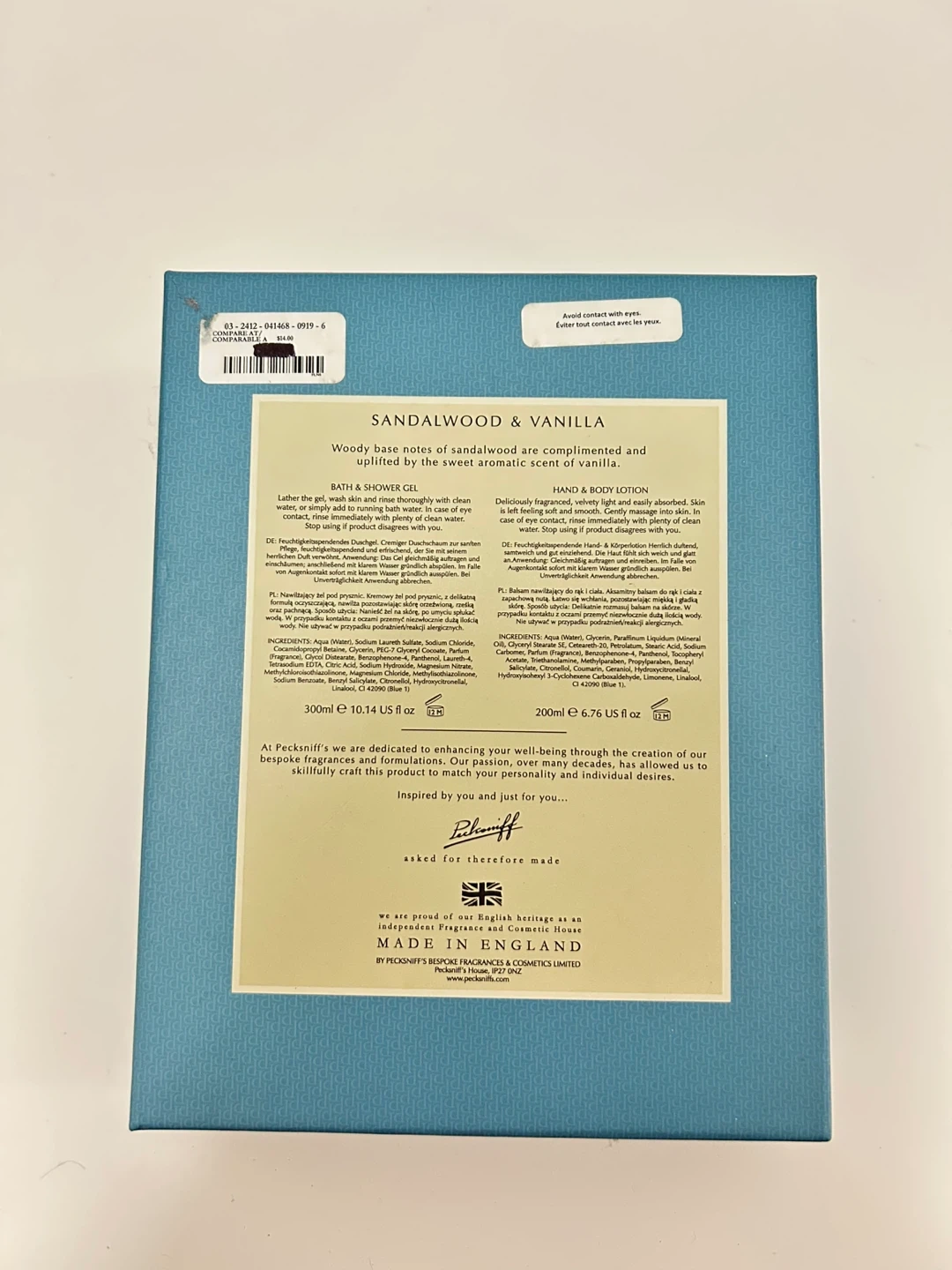 Pecksniff's England Sandalwood & Vanilla hand and body lotion (200ml). The woody base notes of sandalwood are complimented and uplifted by the sweet aromatic scent of vanilla. The box is included!