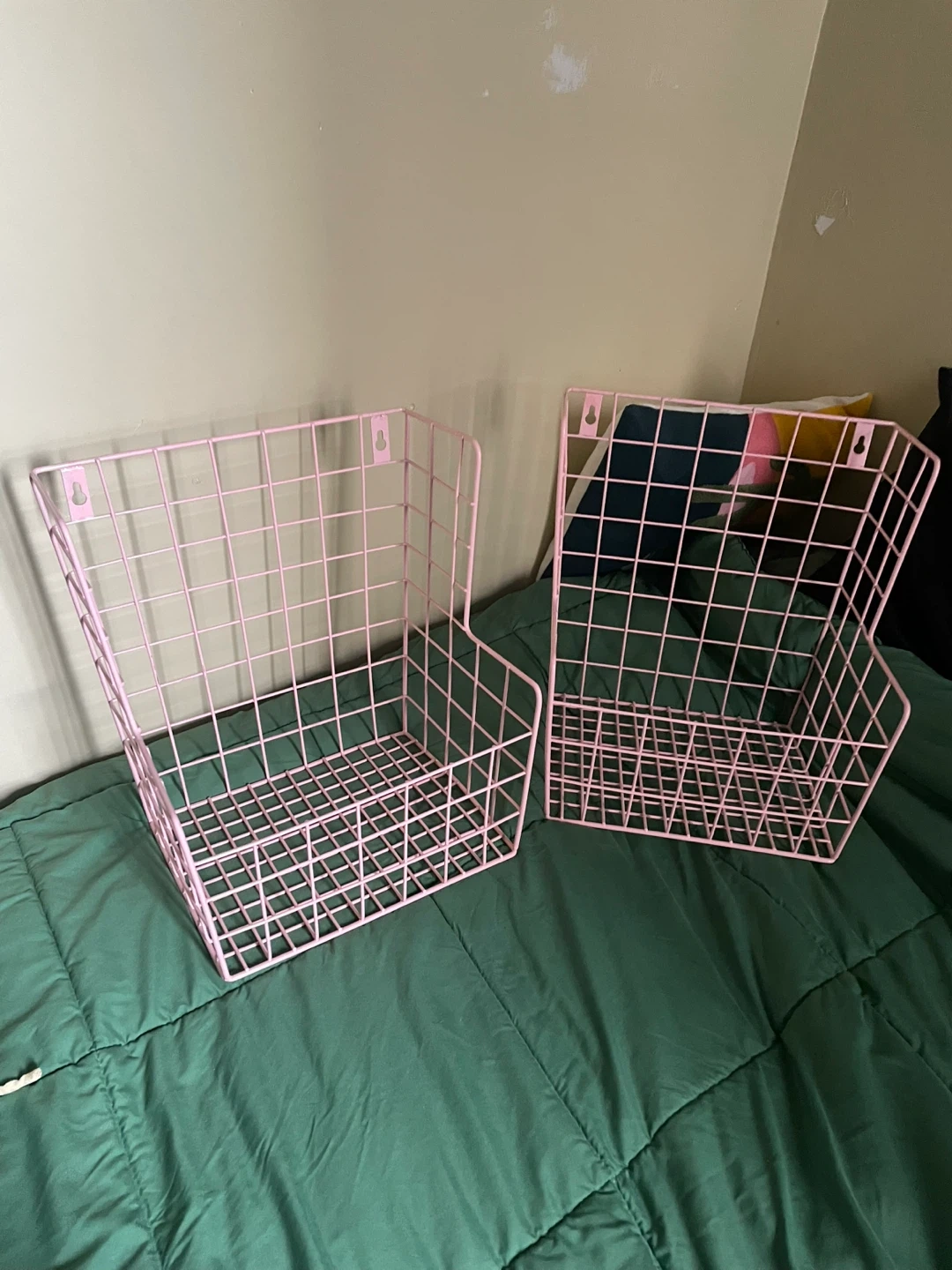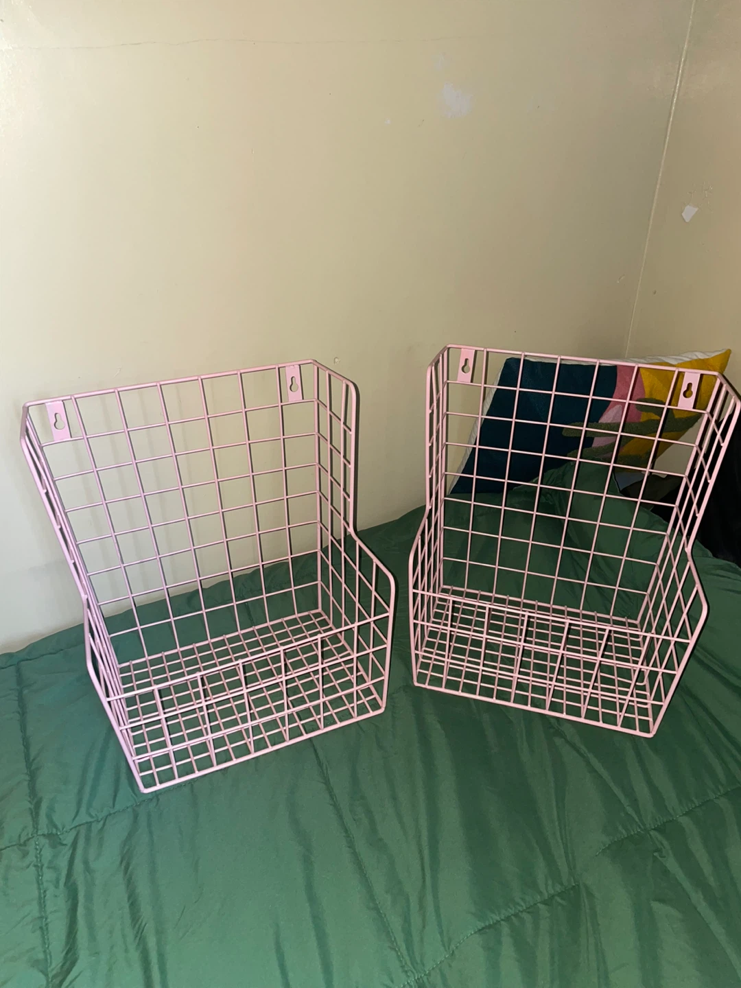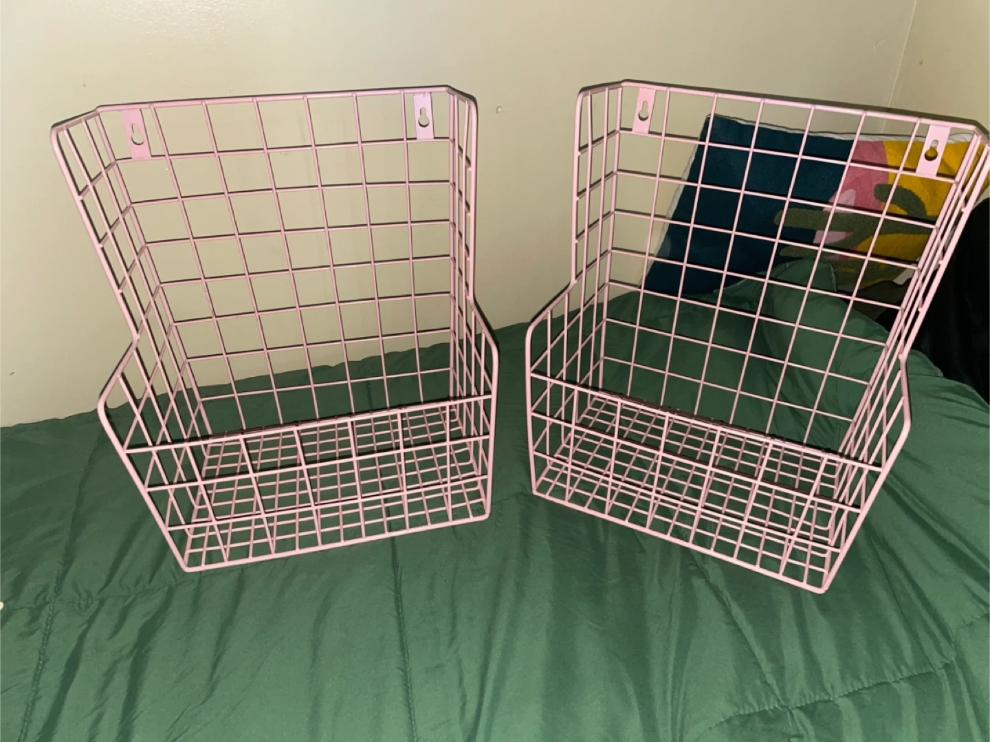 Selling a set of two pink wire wall baskets! They're perfect for adding a touch of organization and style to any room. These baskets are in great condition and ready to hold your favorite items. Only selling because im moving countries!