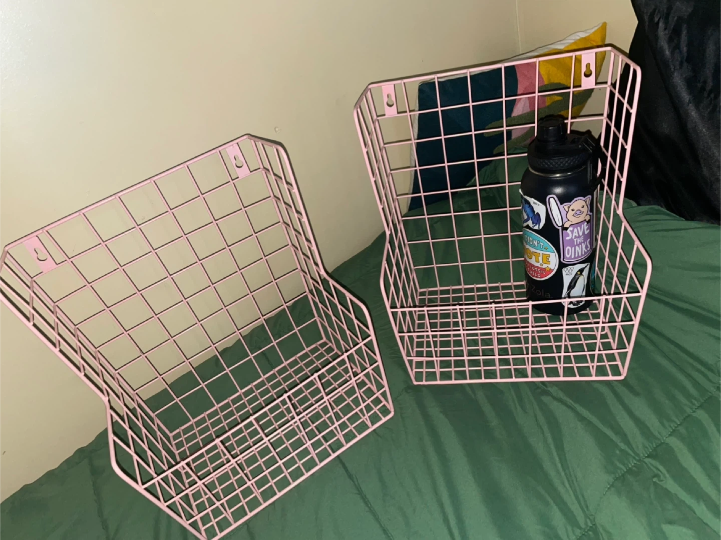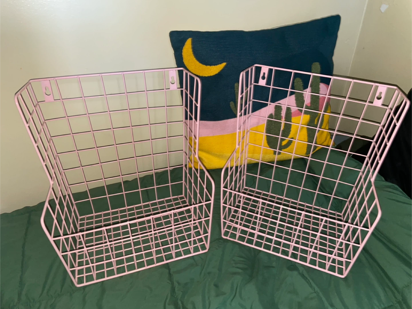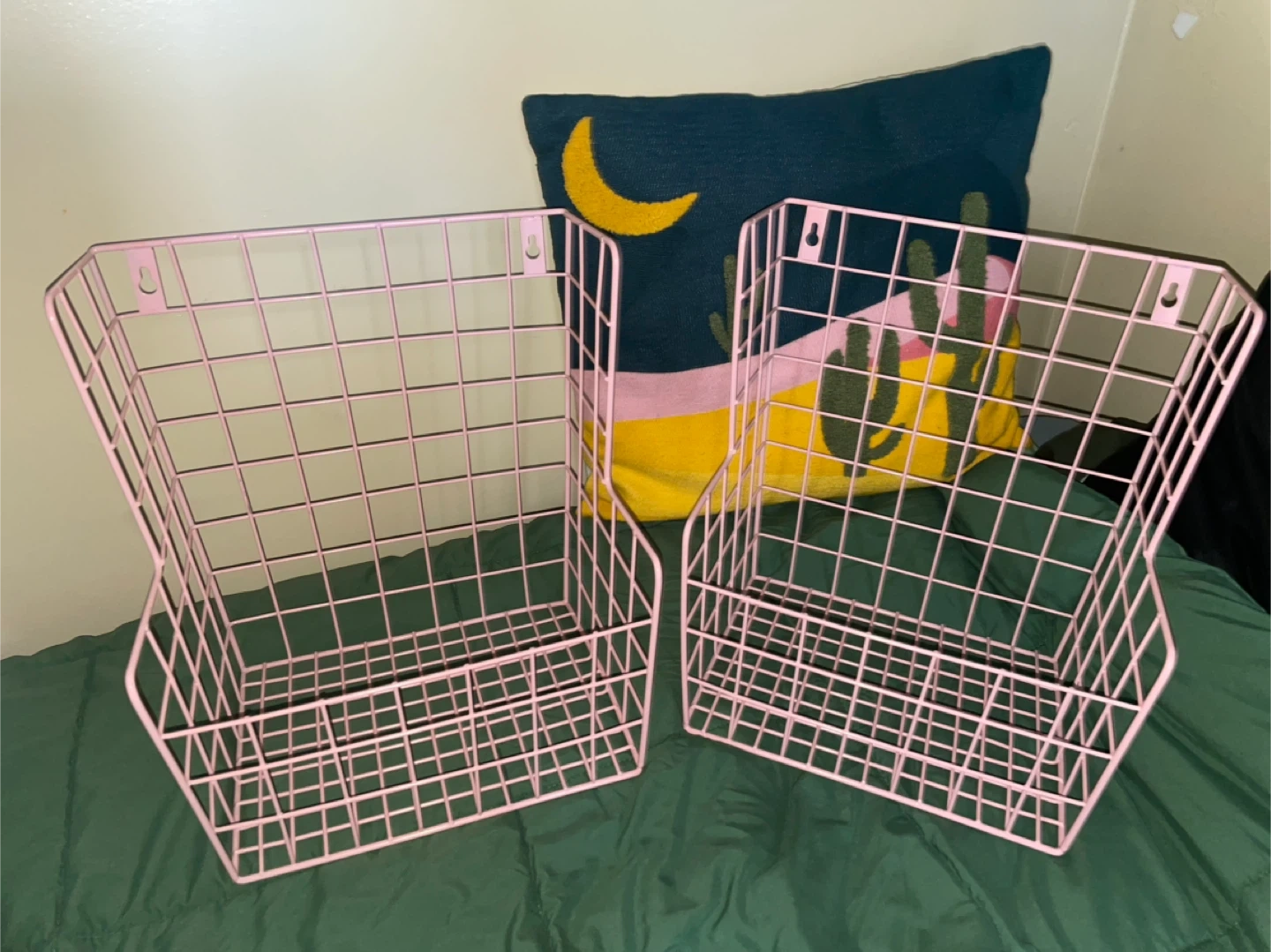 Selling a set of two pink wire wall baskets! They're perfect for adding a touch of organization and style to any room. These baskets are in great condition and ready to hold your favorite items. Only selling because im moving countries!
