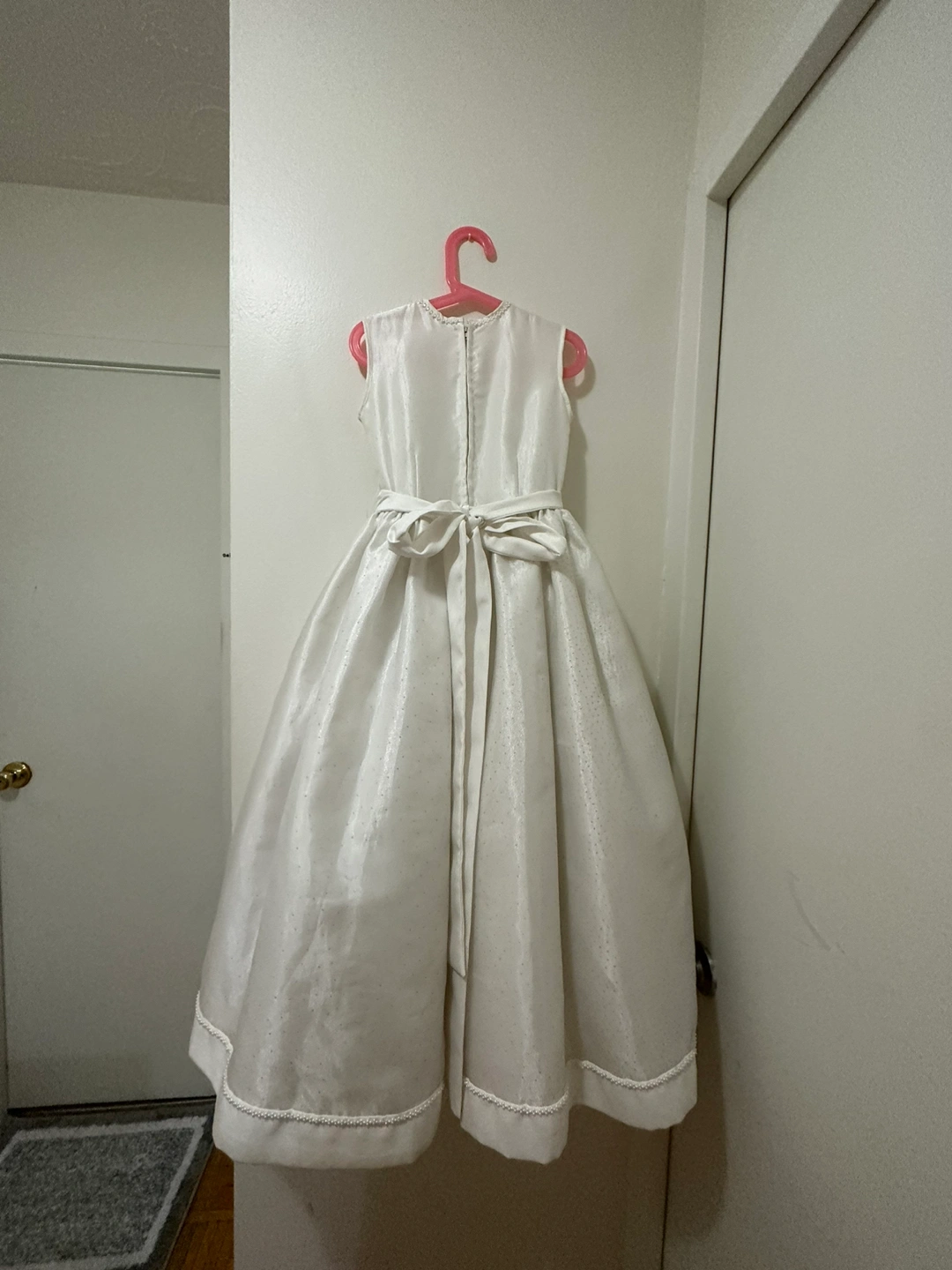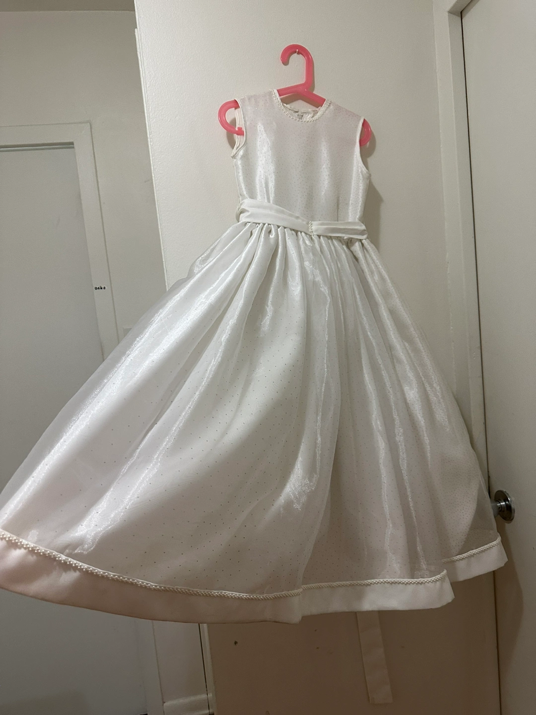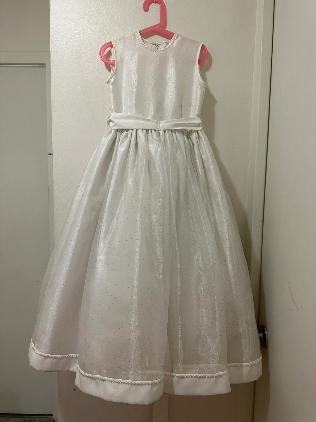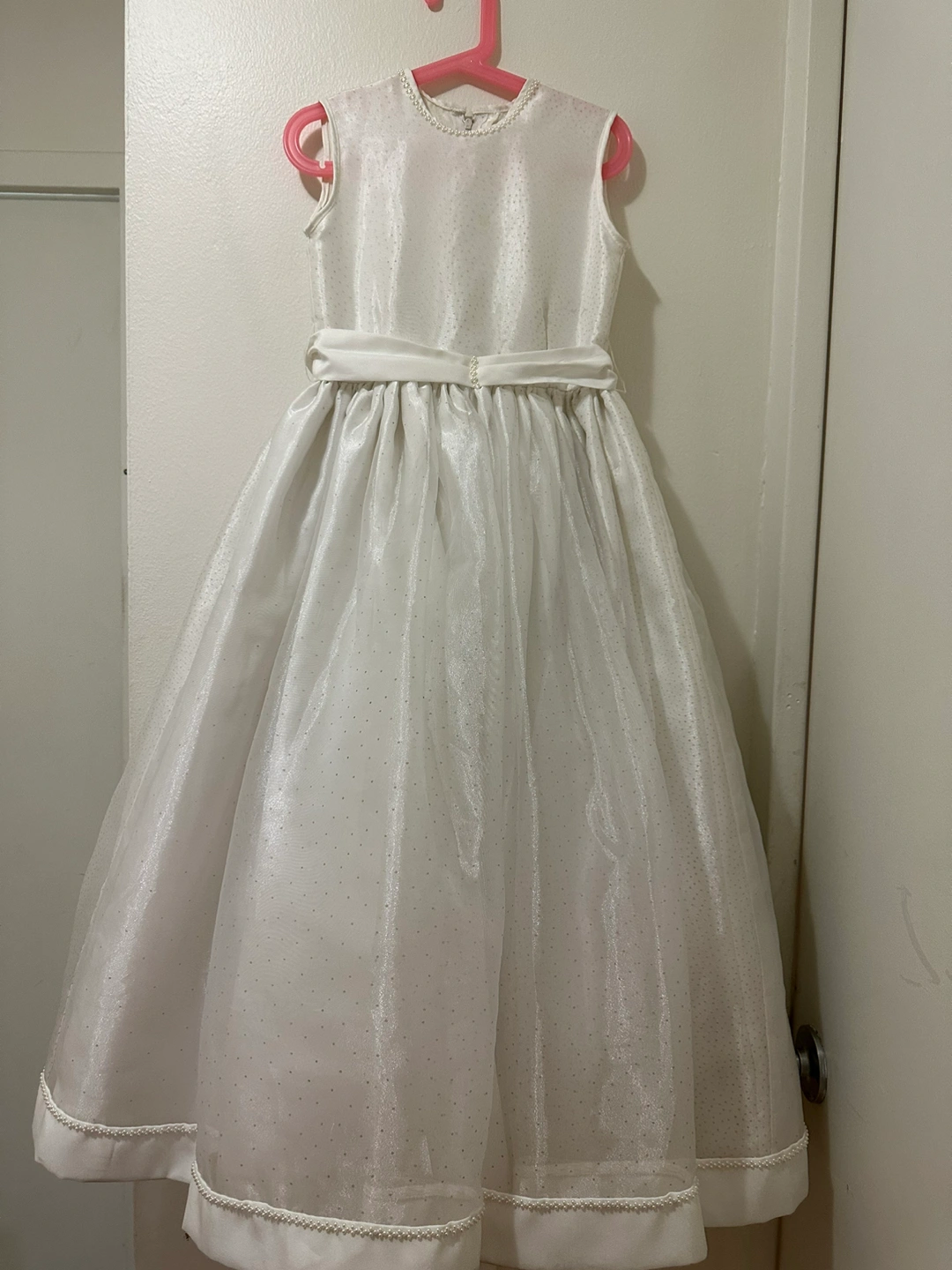 76This dress has a lot of meaning to us, however we feel another Girl can use it for their first communion, is elegant simple beautiful and very well made haute couture * Fully Satin, Sleeveless Formal First Communion Flower Girl Featuring satin bodice and lace overlay A-line dress, satin waist band with small Pearl beads and centre back zipper closure. Ankle-length.