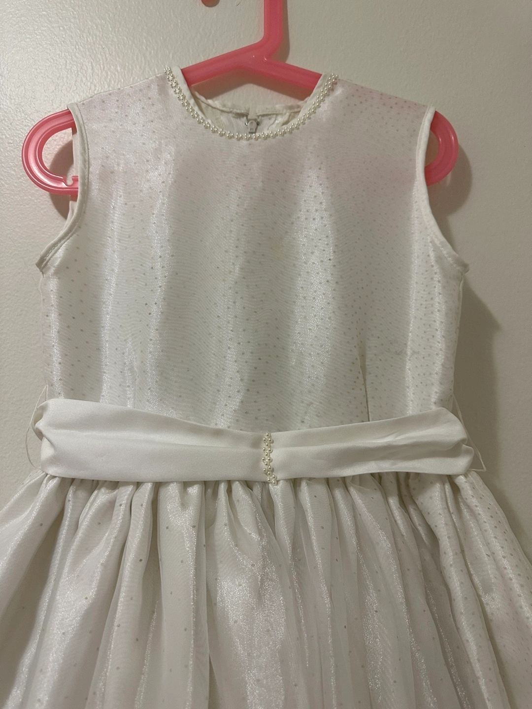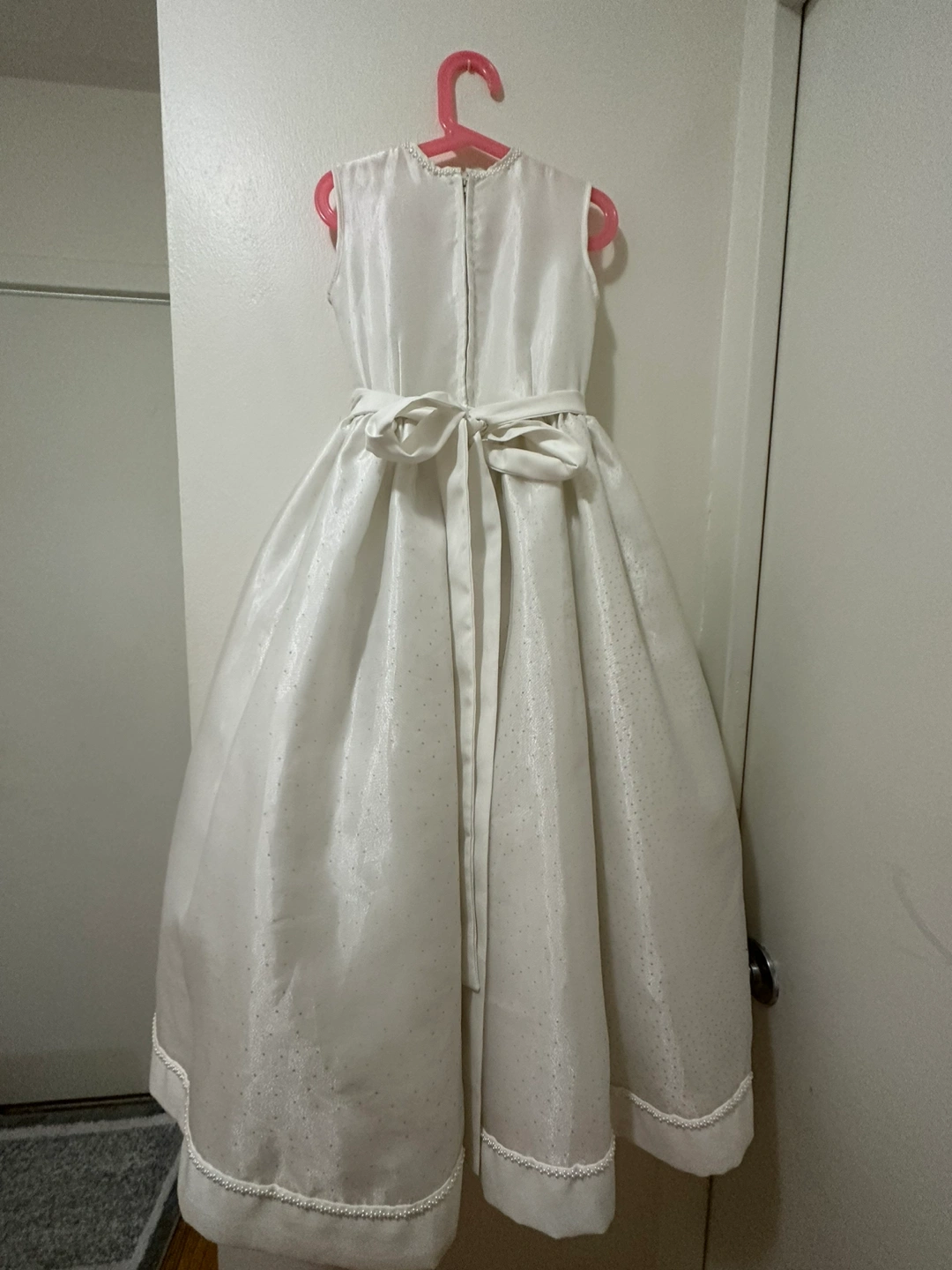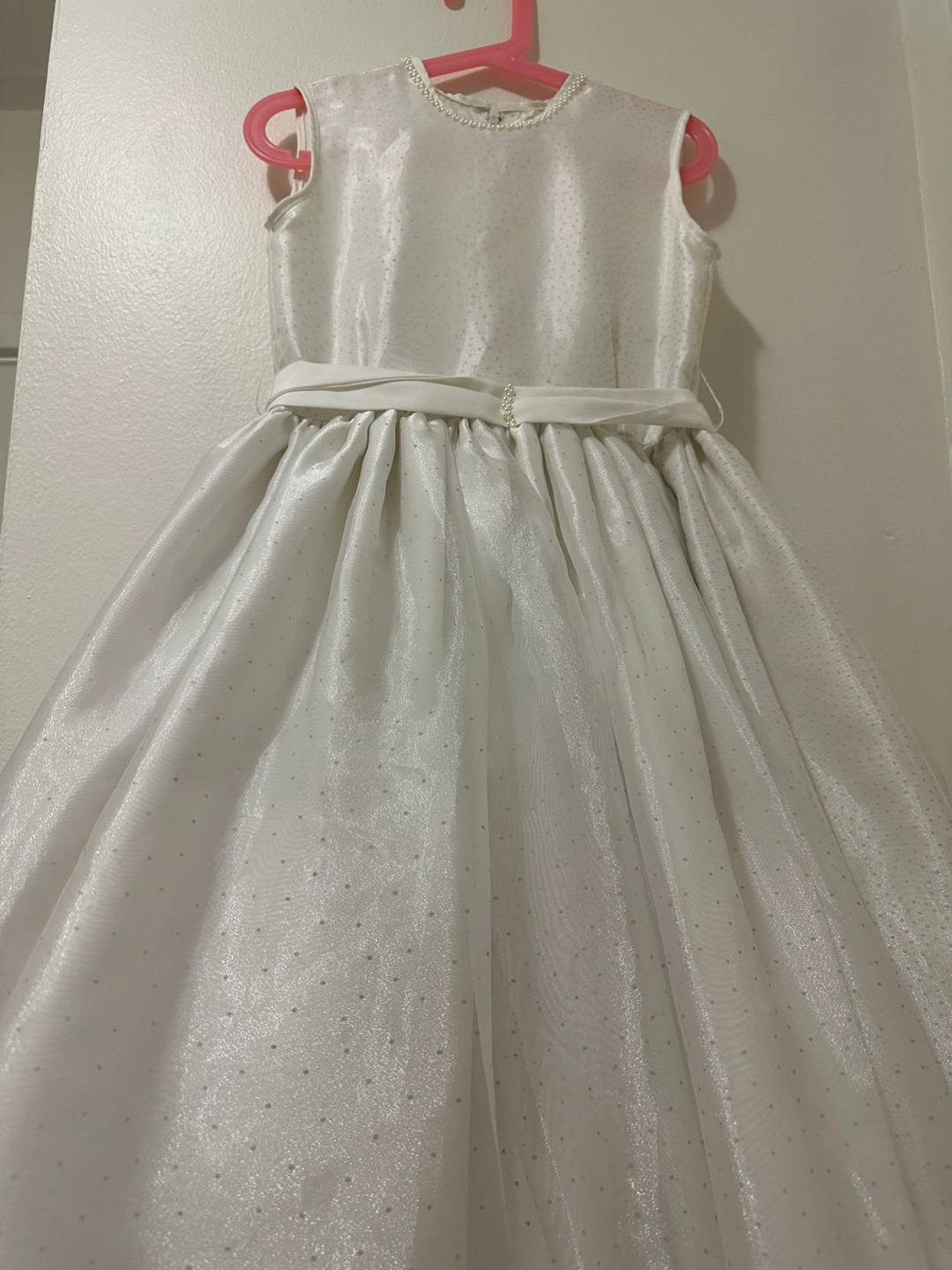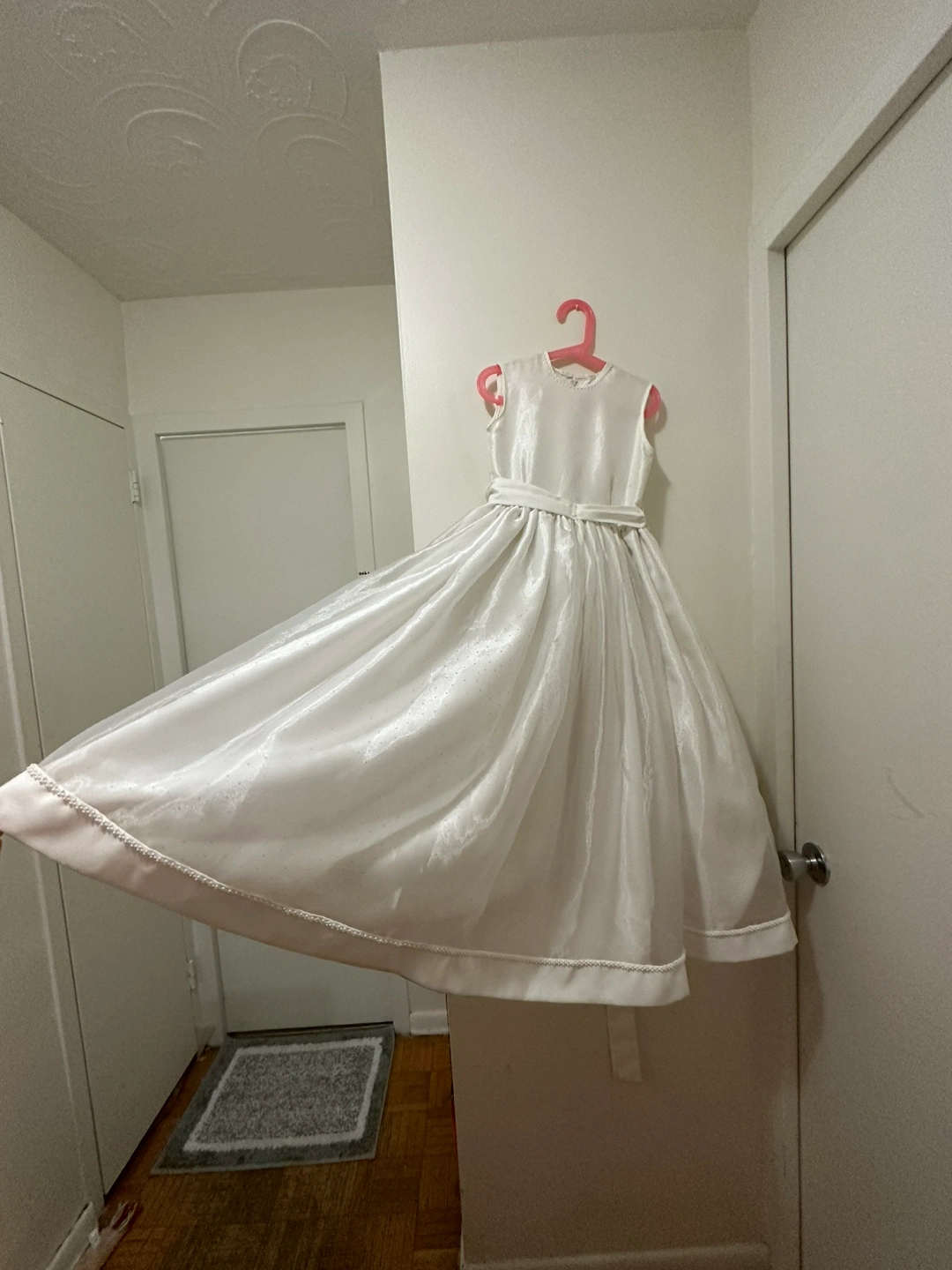 76This dress has a lot of meaning to us, however we feel another Girl can use it for their first communion, is elegant simple beautiful and very well made haute couture * Fully Satin, Sleeveless Formal First Communion Flower Girl Featuring satin bodice and lace overlay A-line dress, satin waist band with small Pearl beads and centre back zipper closure. Ankle-length.