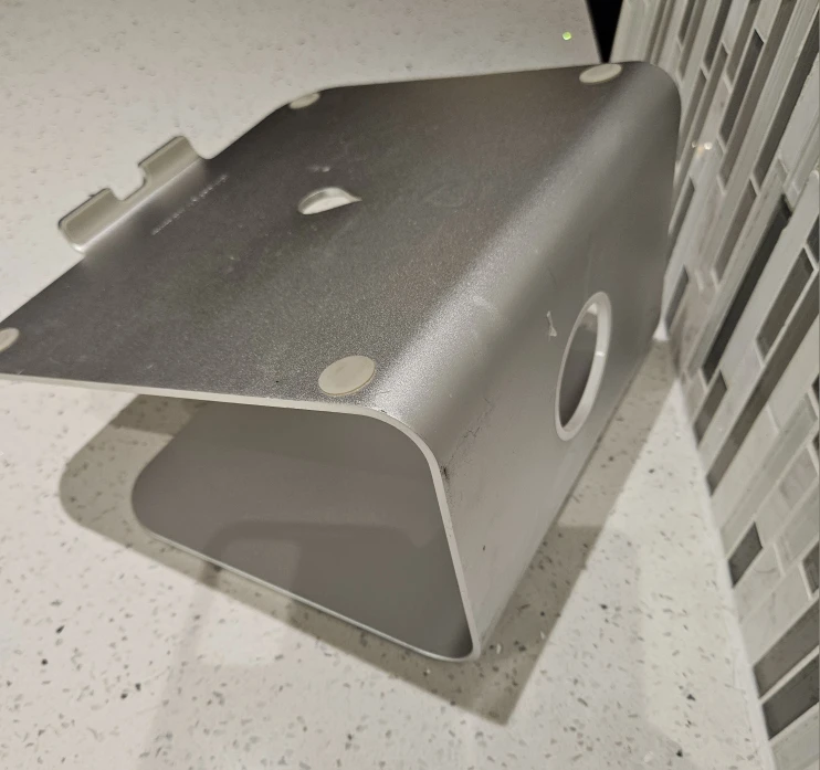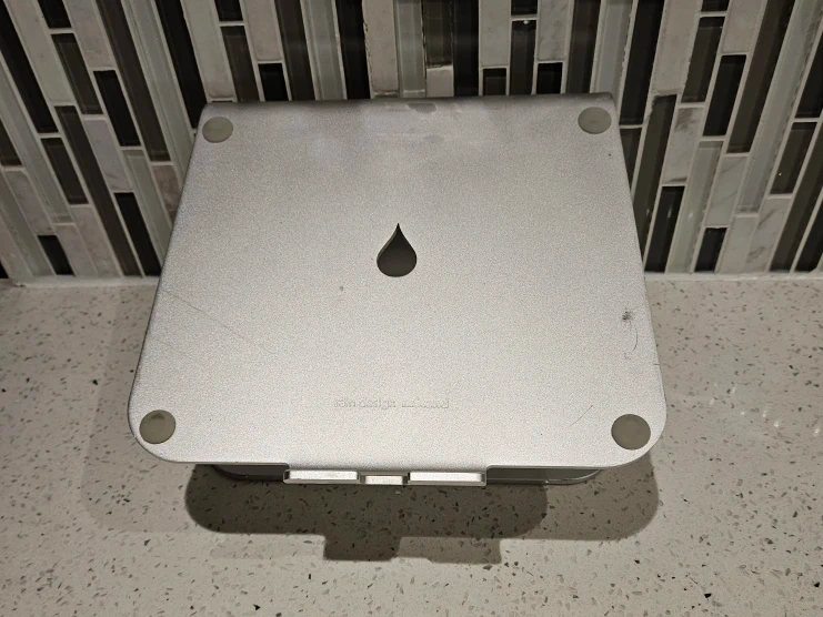Selling a Rain Design mStand laptop stand in silver. It's in good condition and perfect for raising your laptop to a more comfortable viewing height. There are some signs of use such as minor scratches. Sturdy and level.