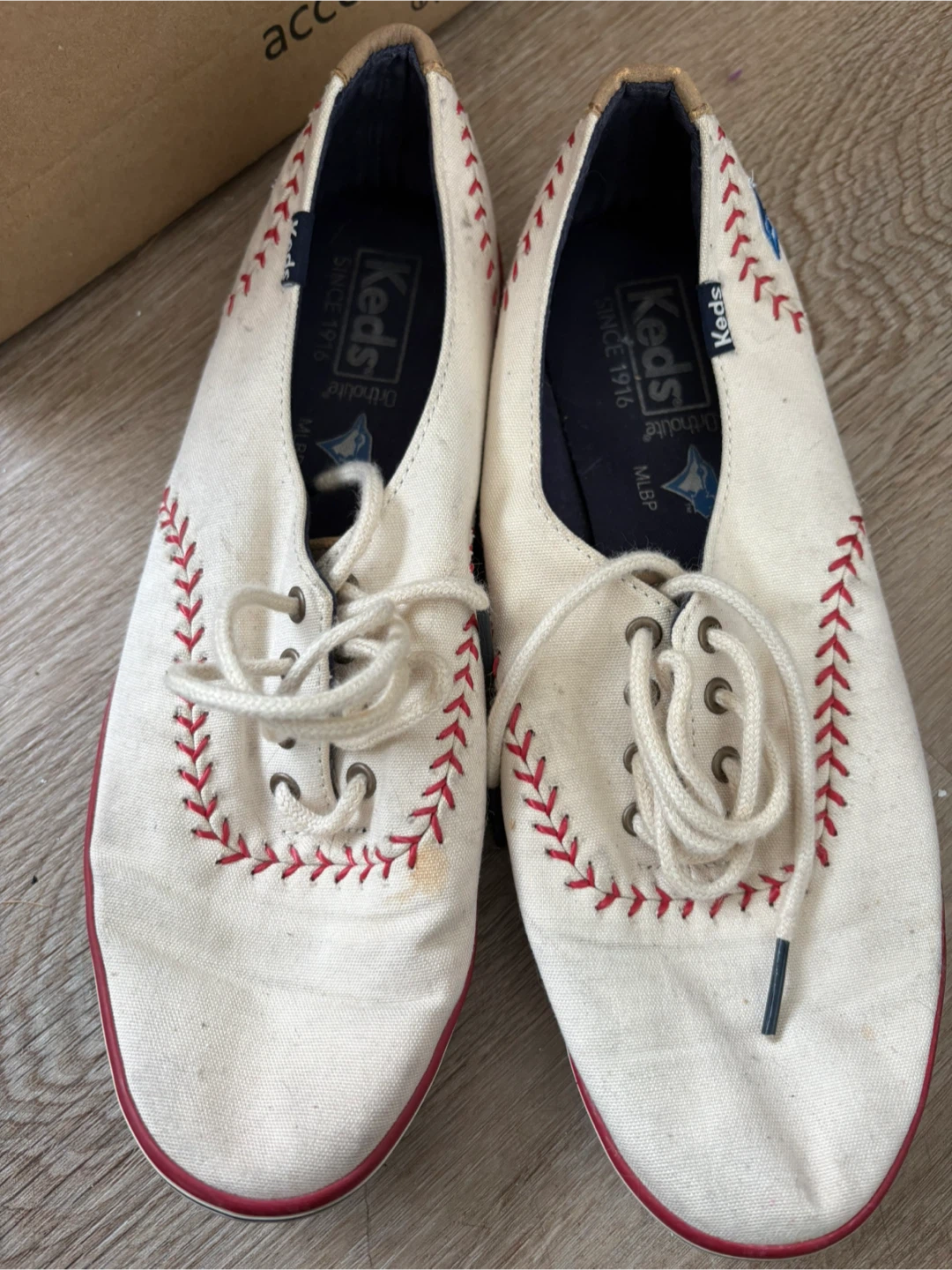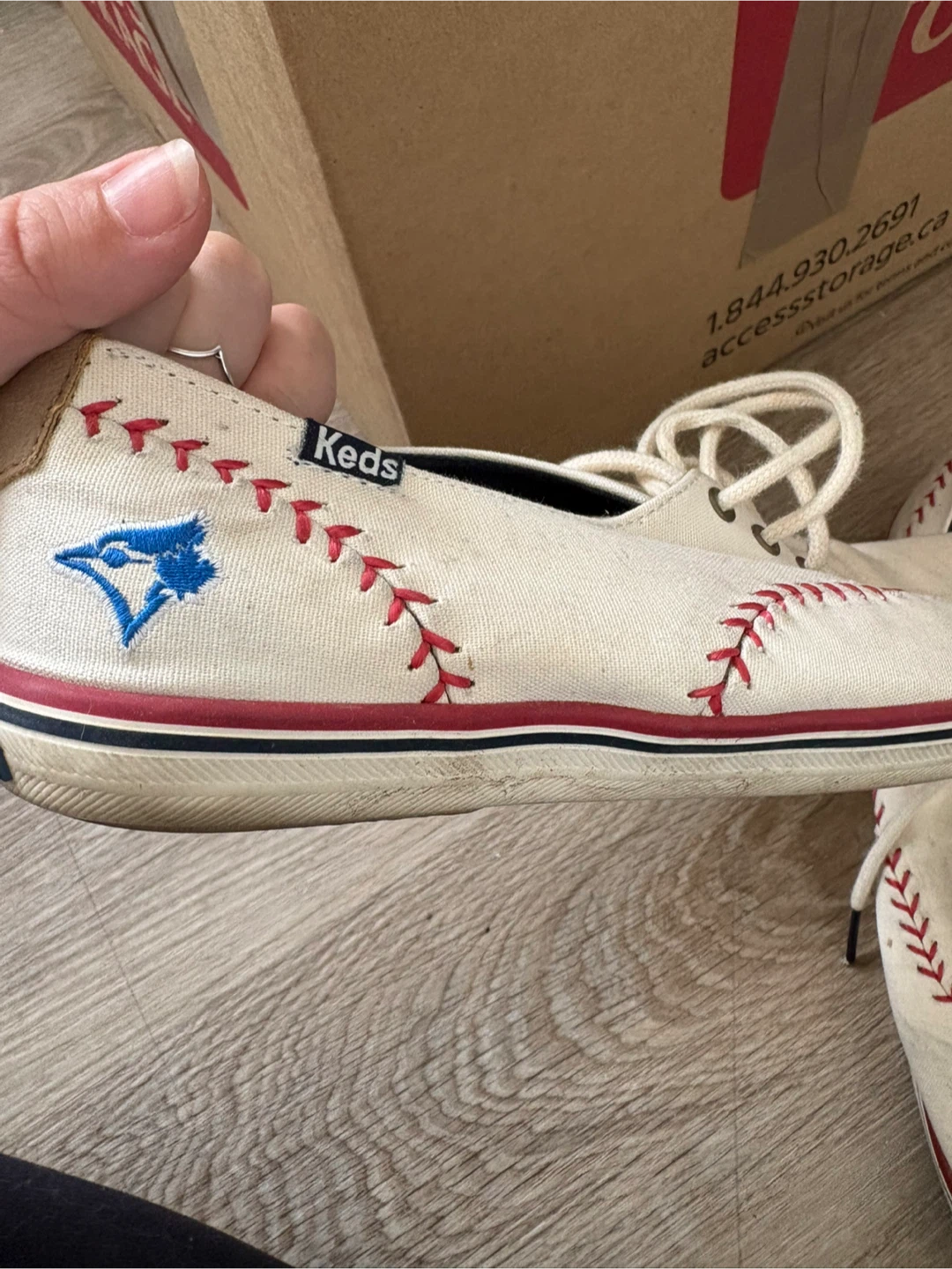 Blue Jays Keds, size 7 I think. Had for several years, wore maybe three times. Discoloured slightly, one spot on the top of one of them.