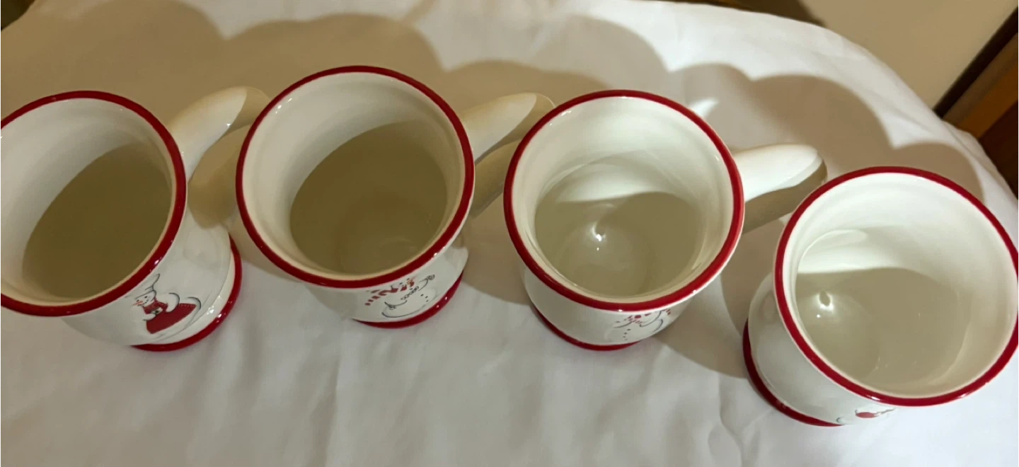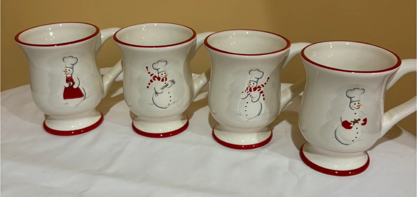 Selling a set of 4 adorable Christmas mugs! These mugs are white with a red rim and base, and each features a cute snowman design wearing a chef's hat and apron. Perfect for enjoying hot cocoa or coffee during the holiday season
