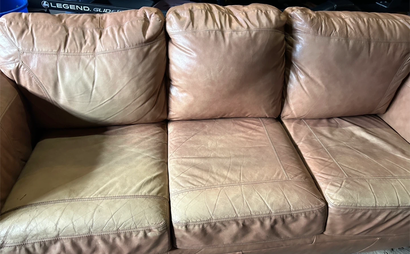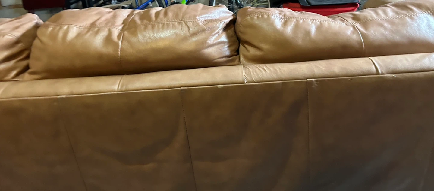 This is a well loved full length three seater leather sofa, price to sell. Need this gone by December 13 at the latest. If you’re looking for a sofa for your dorm room or first apartment, rec room, kids playroom or maybe a cottage then this might be the sofa for you. As it’s all leather it’s very easy cleanup if there are any spills and since it’s already used, you don’t need to worry about losing any value if it gets scratched.