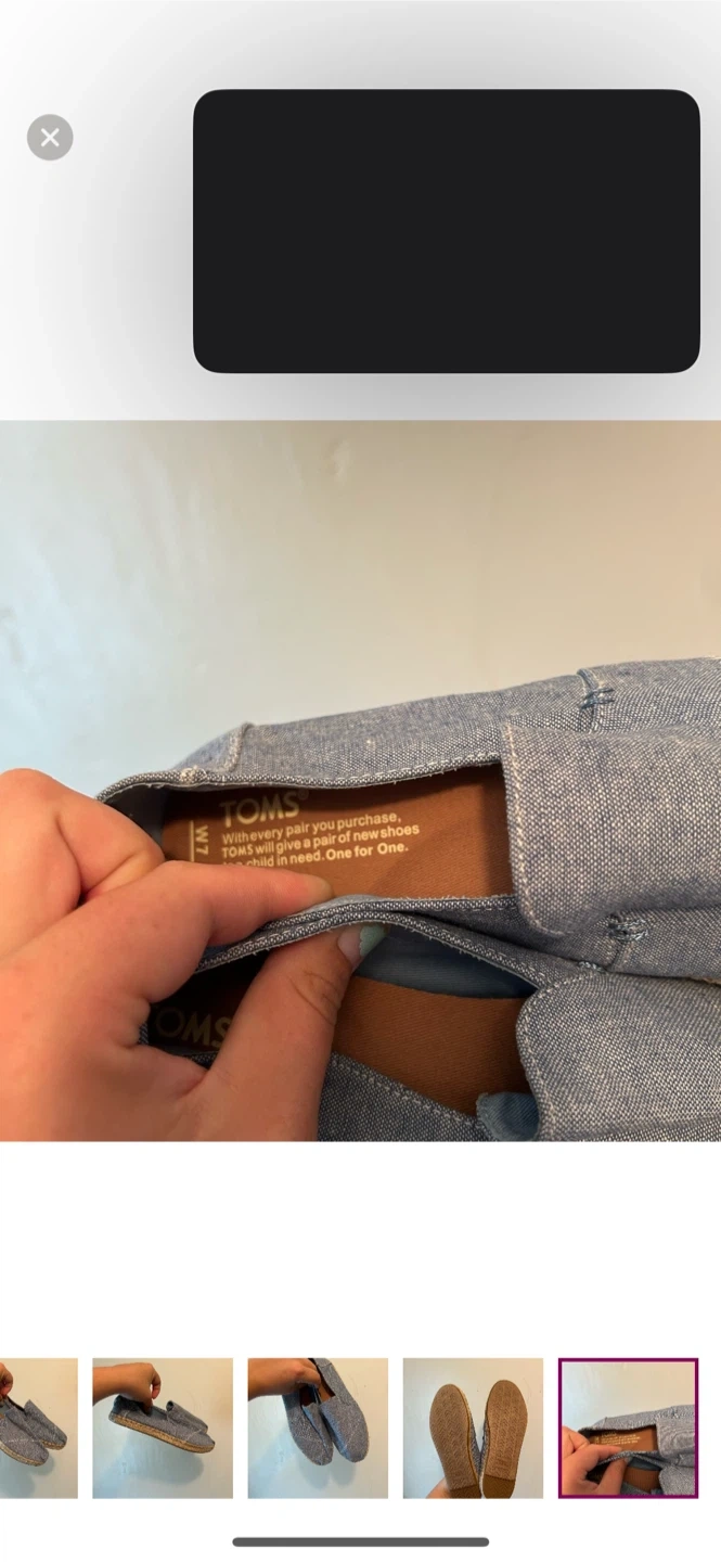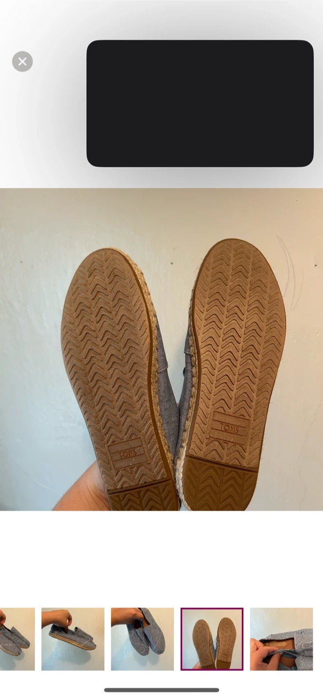 TOMS Brand. Slip on flat shoes. Denim looking blue with woven sole trim. Size women’s 7. Brand new condition