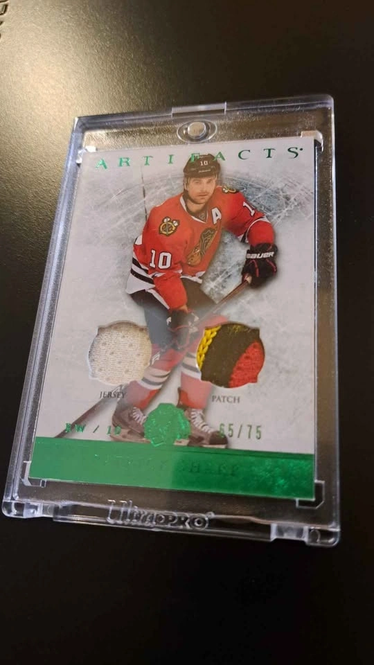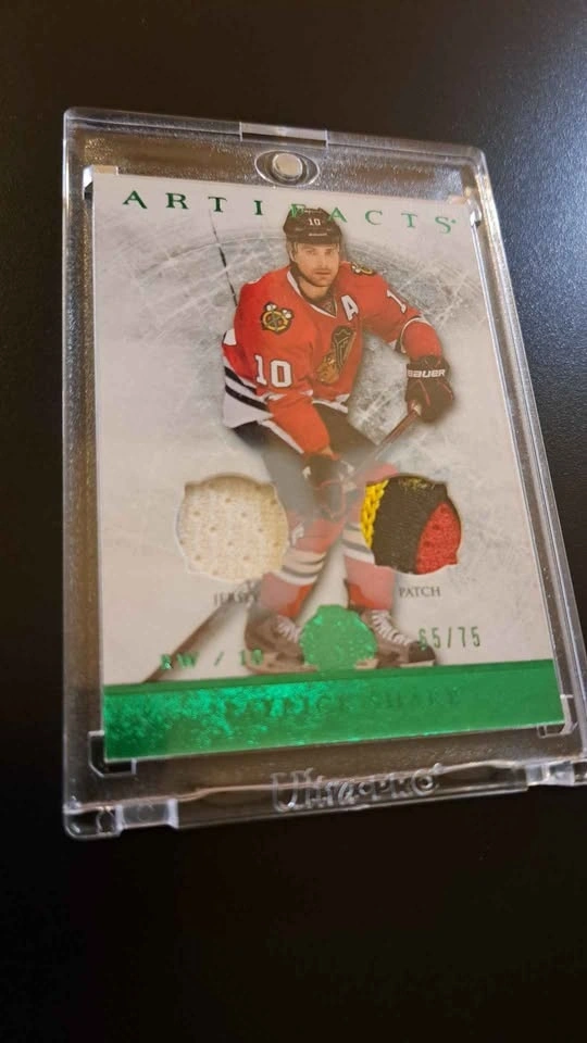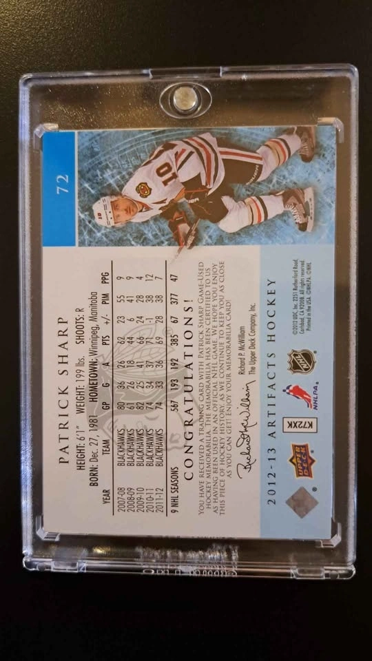 Very nice game on materials emeralds card of Patrick Sharp from the Chicago Blackhawks. Card is protected in a one touch hard case.