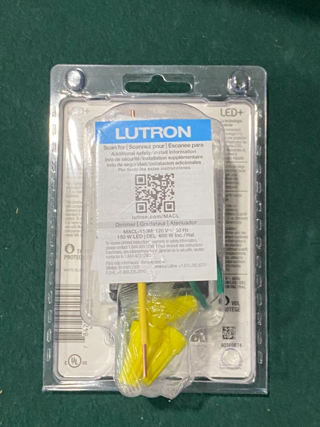 Selling a brand new Lutron Maestro LED+ Dimmer, model MACL-153MH! It's still in its original packaging and ready for a new home. This dimmer is designed with advanced technology to adjust and improve LED performance. It's also compatible with existing wiring and is a 15-minute install