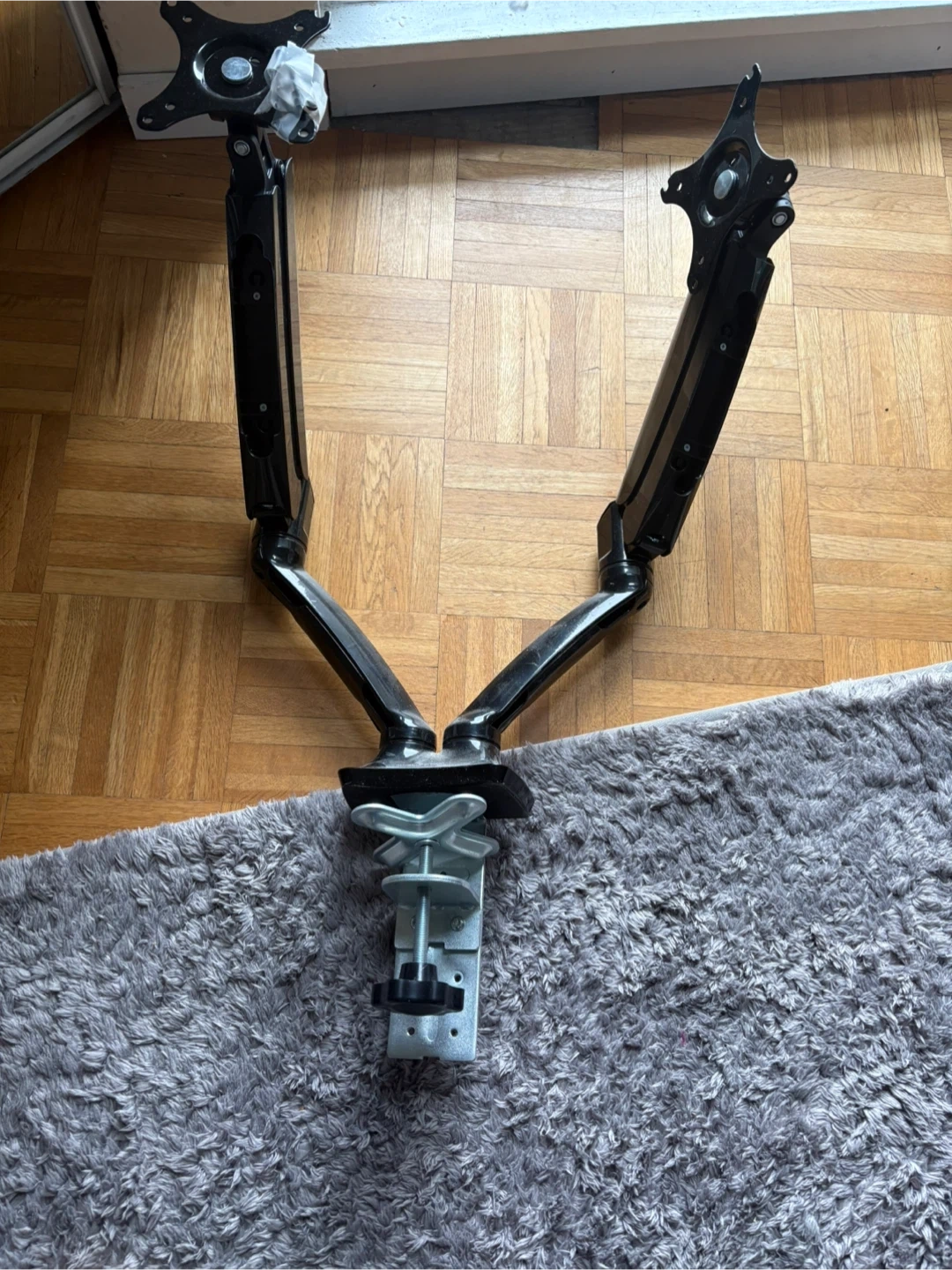 Selling a dual monitor desk mount in black. It's in great condition and ready to help you optimize your workspace! Perfect for creating an ergonomic setup at home or in the office