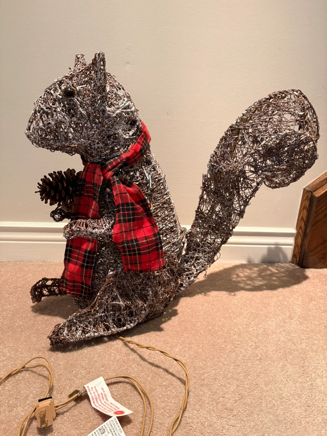 This adorable wire squirrel decoration is perfect for adding a touch of rustic charm to your holiday décor! It features a red plaid scarf and holds a pinecone. It also lights up to create a warm and inviting glow. Great for indoor use during the Christmas season! Indoor outdoor use!