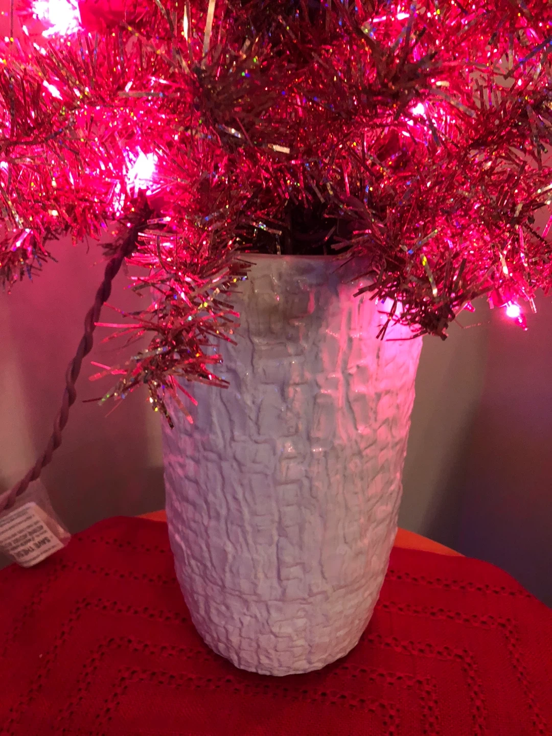 Here's a cute little pink tinsel Christmas tree that's all lit up and ready to go! It's perfect for adding a festive touch to a small space or as an extra tree for the holidays
